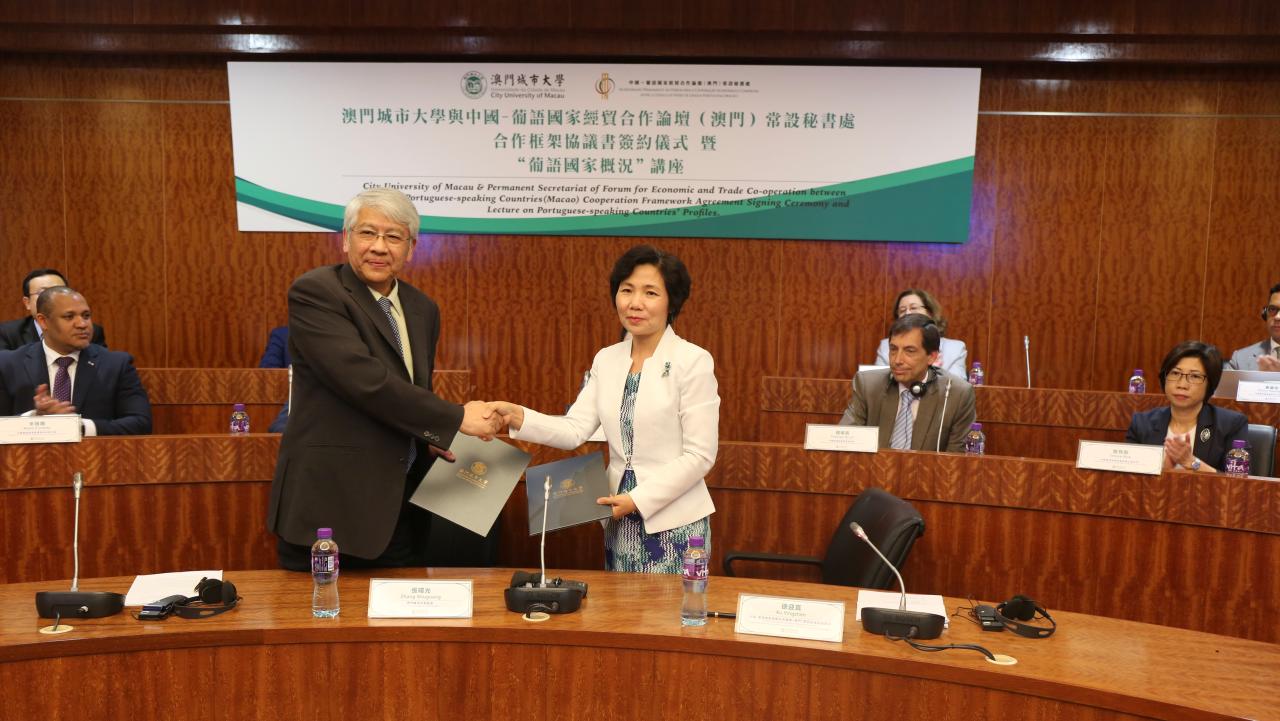 2018年5月25日,中国-葡语国家经贸合作论坛(澳门)常设秘书处徐迎真秘书长与澳门城市大学张曙光校长签署合作框架协议。双方共同举办“葡语国家概况”讲座,葡语国家派驻代表分别向在座师生介绍其国家概况。