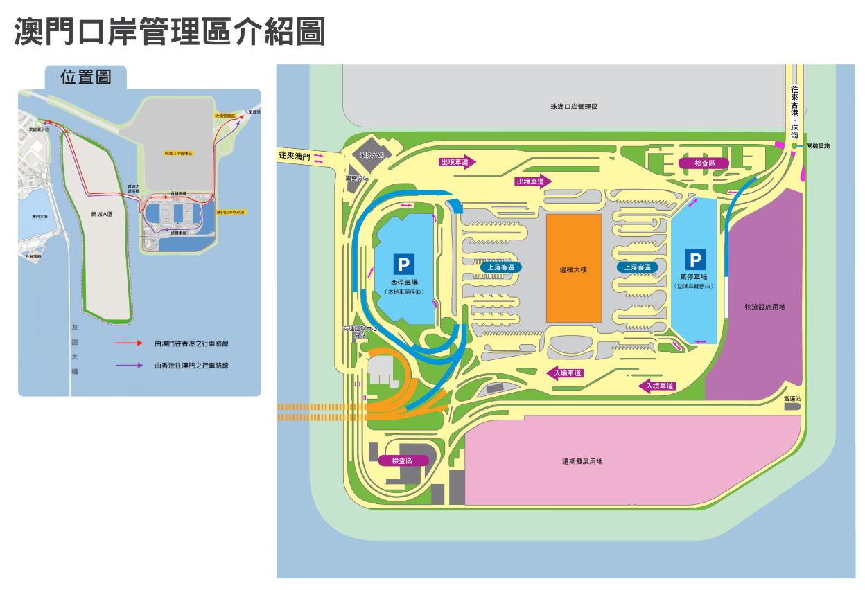 连接粤港澳三地的“港珠澳大桥”即将开通,各部门现正积极细化口岸区内的各项安排,为正式投入运作作好准备。在交通设施方面,澳门口岸管理区设有东、西两个停车场,分别面向访澳旅客和本地居民。东停车场提供3,000个轻型汽车泊车位,让经大桥来澳的车辆停泊。市民及访澳旅客到达口岸管理区办理入境手续后,可于西区地面层(上客区)选乘不同的交通工具进入澳门市区,上客区内分别设有公共巴士站、的士站、轻型汽车及摩托车上客区、旅行社重型客车上客区、酒店重型客车上客区、娱乐场重型客车上客区、跨境旅游巴士上客区、跨境轻型汽车上客区及重型客车停泊区。