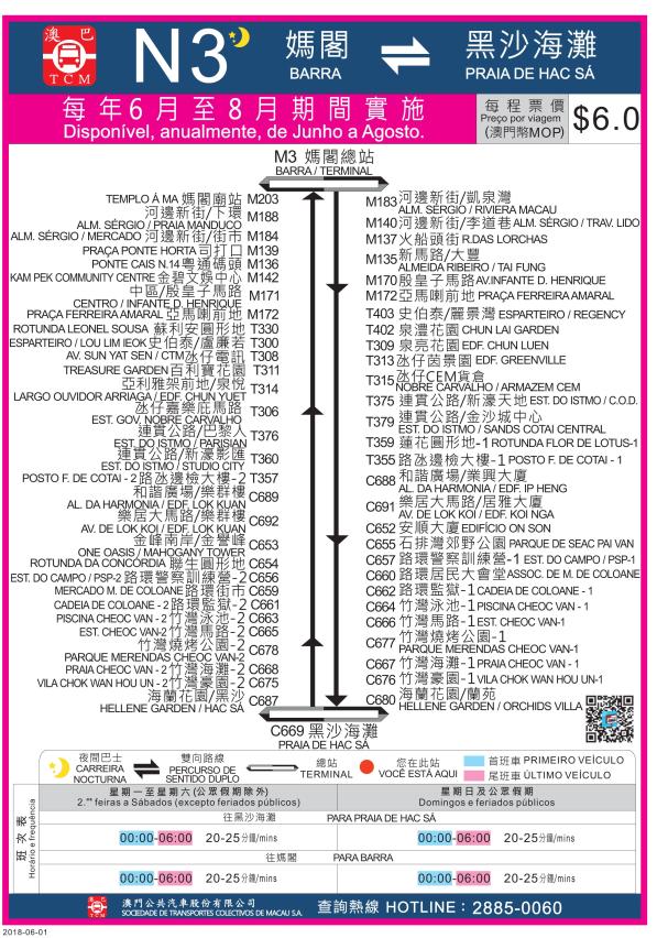 配合暑假到来,多条路线巴士将有所调整。其中为方便公众前往竹湾及黑沙海滩游乐,N3夜间巴士路线在6月至8月期间,新增前往竹湾泳池、竹湾烧烤公园、竹湾海滩及黑沙海滩等地,往妈阁及往黑沙方向的首班车均划一由凌晨零时发出,尾班车时间则为早上六时,班次频率为20至25分钟一班。