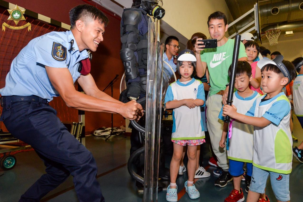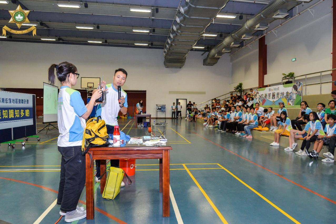 在“迎新聚旧竞技会”当天,治安警察局为新旧小警苗准备了多项有益身心的团队竞技游戏以及精彩丰富的体验活动,包括小警车驾驶、警犬教学、装备展览及试穿等,现场气氛热烈。此外,踏入台风季节,活动亦加入了“防灾知识合多啲”的教学环节,从提早准备好用水、粮食、应急药物、生活用品,到灾害发生时应如何遵照民防架构发出的指示和呼吁,尽早远离低洼地区,及时疏散到安全的地方暂避,保障一家大小的安全程序,都一一透过互动和展示的方式,向各位小警苗和同事们进行介绍,整个教学寓学习于游戏,务求令防灾的意识从小渗透到参与者的脑海里,达到防灾从小警苗开始做起。