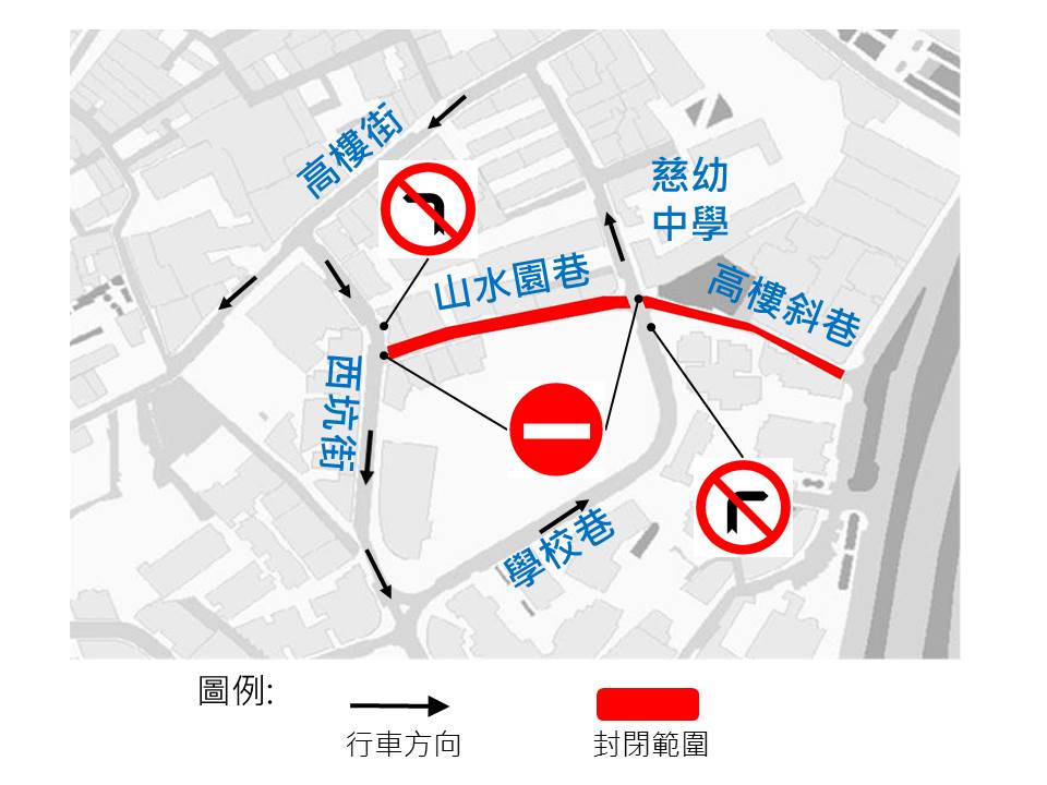 因铺设电缆、水管和管道、接驳街渠及整治行人道,7月25日(周三)至8月11日(周六),高楼斜巷及山水园巷封闭交通,山水园巷部份咪表泊车位及摩托车泊车位暂停使用,交通事务局呼吁公众留意。