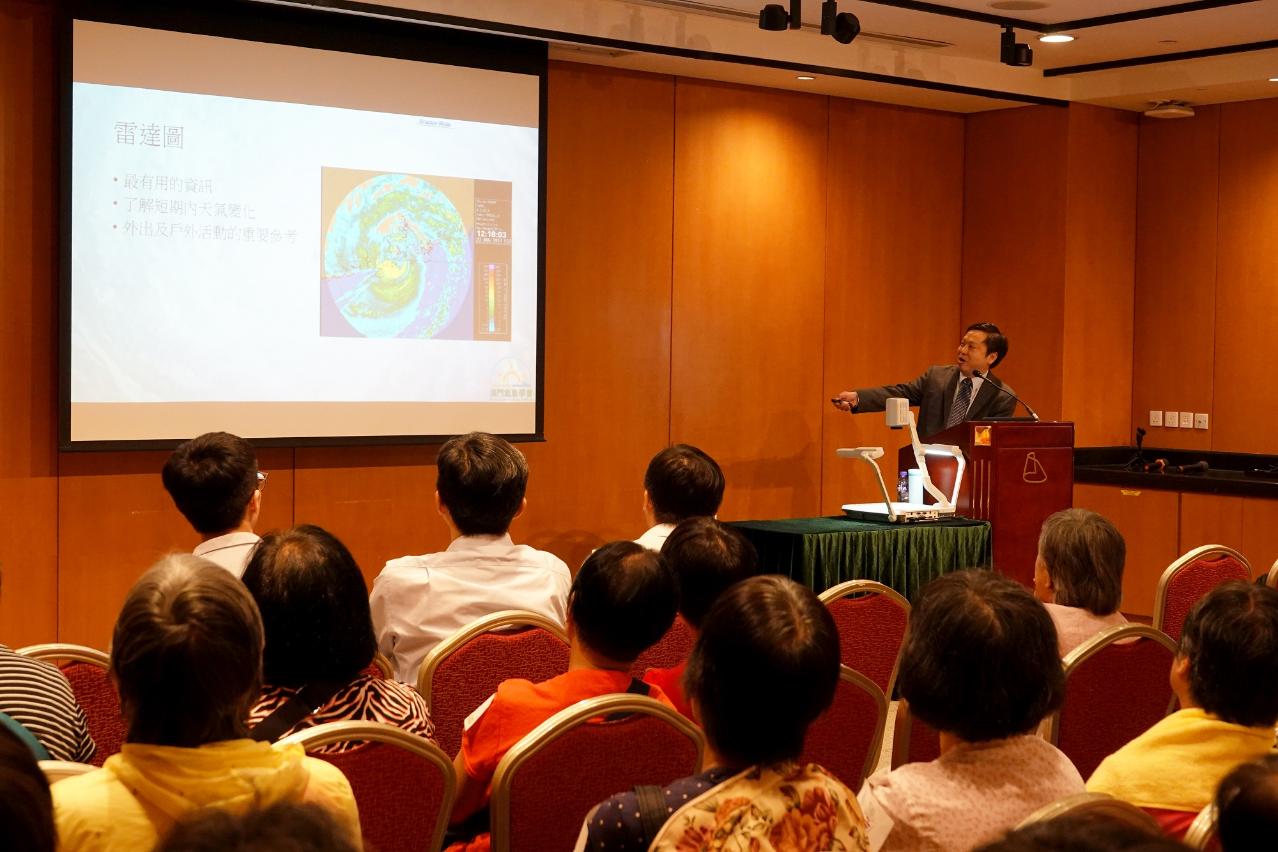 气象防灾讲座由气象局气象技术员叶婷婷和气象学会会长方志刚主持,主要向参与者讲解第61/2018号行政命令中《热带气旋信号》及第76/2018号行政命令中《风暴潮警告系统》、台风和风暴潮的基础知识、安全措施和天气变化、澳港两地发出风球的时间常有差异的原因、以及天气预报工作的困难和限制等。