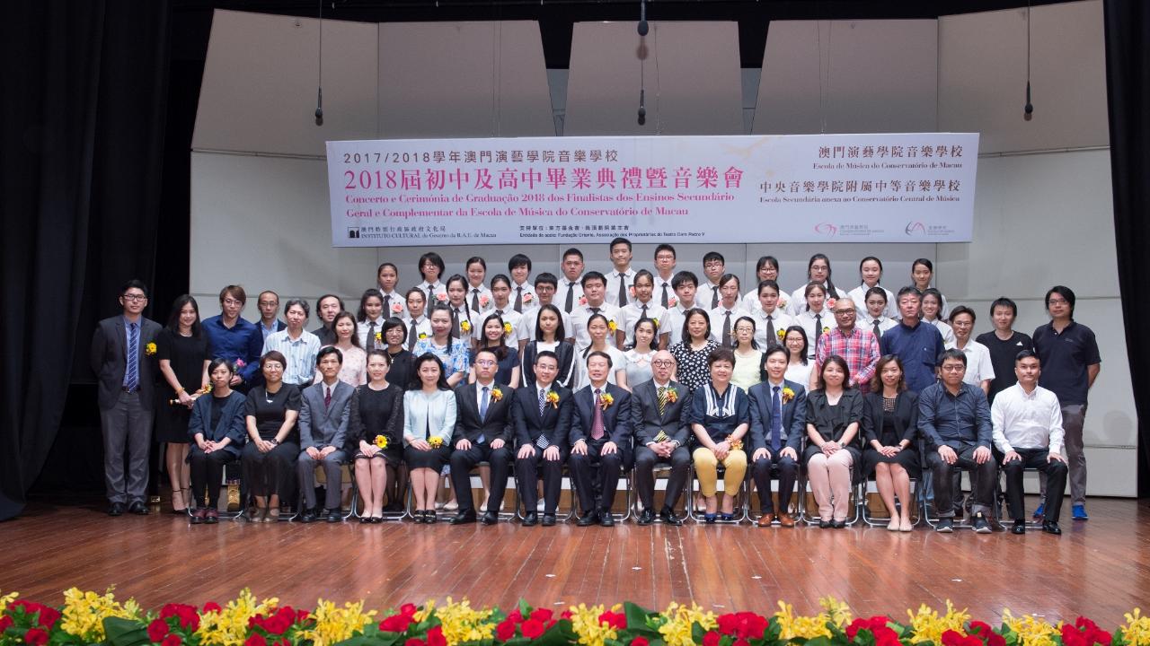 七月十二日举行2018届初中及高中毕业典礼暨音乐会,多位成绩优异的毕业生在音乐会上进行独奏及重奏表演,汇报多年学习成果。今年音乐学校第七届中学教育音乐技术高中课程共有十三名学生完成相关课程,其中八位学生获保送中央音乐学院,升大学率达百分之百。典礼上,毕业生获颁发由澳门特区政府认可的初中、高中教育课程文凭和音乐技术及专业资格证书,及由中央音乐学院附属中等音乐学校颁发的《普通中等专业学校毕业证书》,获颁发的证书在澳门、内地乃至于国际上均被认可。
