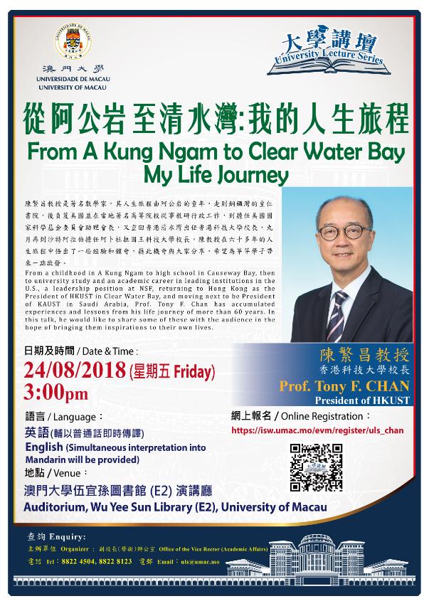 澳门大学将于8月24日(下周五)举行澳大新学年首场“大学讲坛”讲座,邀请了香港科技大学校长陈繁昌担任主讲,以讲题“从阿公岩至清水湾:我的人生旅程”畅谈其人生经历,并与学生交流互动。欢迎有兴趣人士参加。