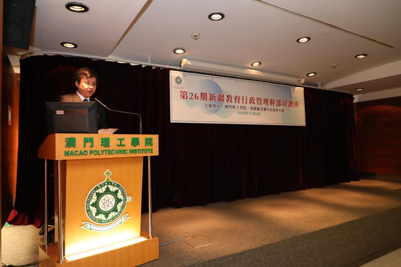 严肇基致词时表示,在澳门特别行政区政府社会文化司和新疆维吾尔族自治区教育厅支持下,理工学院自○四年起开展与新疆多元合作,包括有新疆教育部门干部培训、高中毕业生来澳门就读学位课程、英语师资培训、合办学术研讨会、提升教与学质量的合作、高校科研学术合作及创建两地教育合作可持续发展的平台等方面。目前共有来自新疆的教育干部、大学及基础教育教师、专家、学者及学生共二千五百多人参与了合作项目。其中新疆教育行政管理干部培训班已成功开办二十五个培训班,共计总学员五百零三人。今期理工迎来第二十六班的学员,授课内容除相关理论学习,还将安排讲座、与专业团体交流座谈、参访及文化考察活动,增进学员以多角度对澳门教育、澳门文化、教育管理等方面的学习和理解。