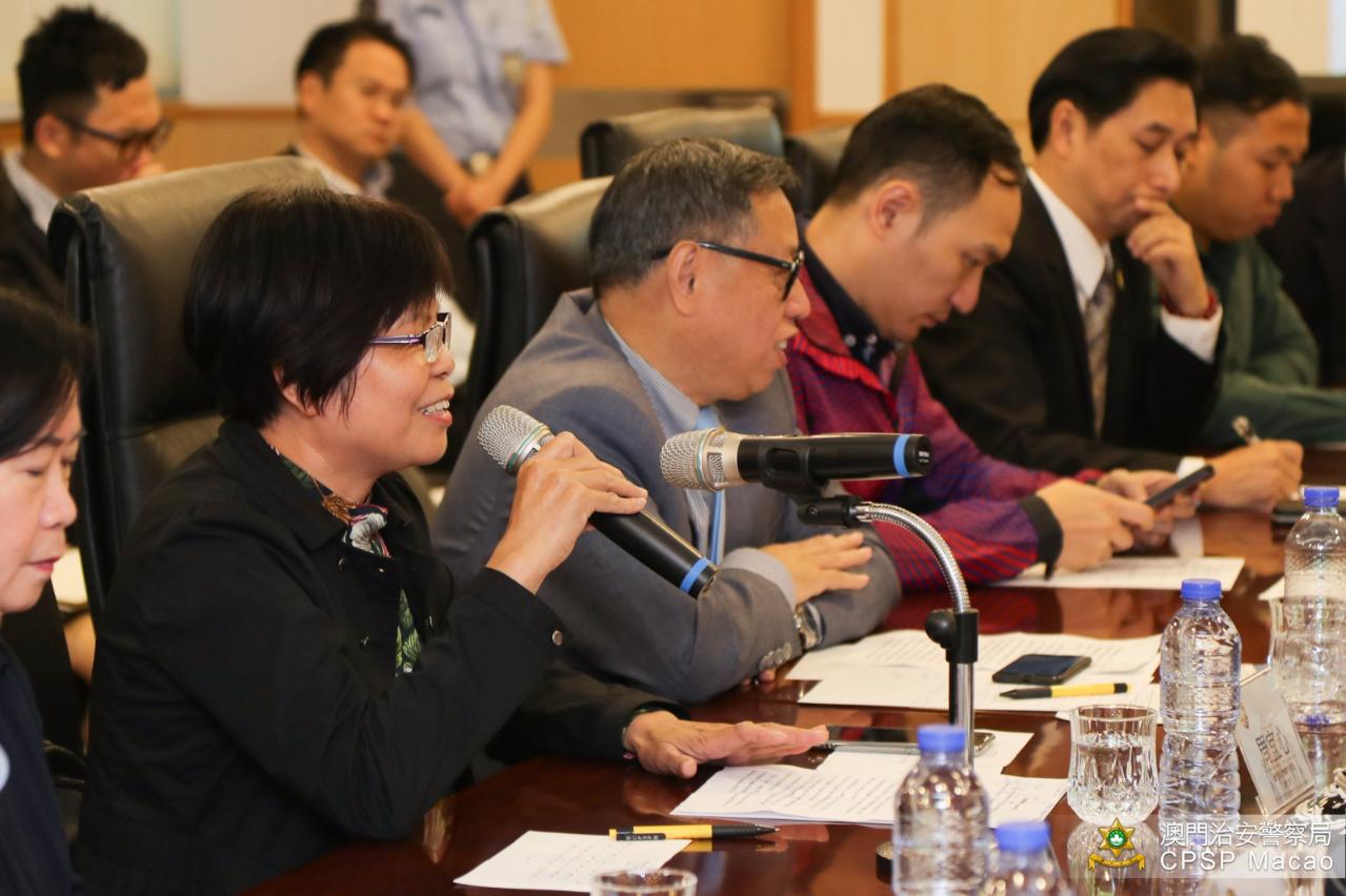 会上,各警务单位代表向与会者简述工作情况。澳门警务厅汇报首三季度的罪案数字和近期治安形势,介绍旅游警察工作的情况及新设置的移动警务室,亦计划于更多地点设置移动警务室;交通厅方面,将继续打击各类型交通违规,如的士违规、超速驾驶、酒驾和药驾等,并因应大赛车赛事举行期间,实施相应交通疏导措施;出入境事务厅则重点介绍港珠澳大桥珠澳旅检大厅实施的“合作查验、一次放行”创新通关模式,指该模式有助缩减旅客轮候时间,提升通关效率;最后,公共关系处总结“社区警务联络机制”的执行情况,并期望不断扩展机制,持续广泛地与社区联系。接着,双方就多个治安议题作深入交流,当中有代表关注外雇人士衍生的治安问题,如非法旅馆和噪音问题等。同时有意见赞扬移动警务室能够更方便市民和旅客报案,认同应在更多地点设置。亦有意见建议当局做好港珠澳大桥口岸边境站的安检措施,保障市民和旅客的安全。最后,双方认同“社区警务联络机制”充分发挥警民合作的作用,期望日后继续多方面配合局方开展的工作,共同携手为本澳治安与社会稳定作出贡献。