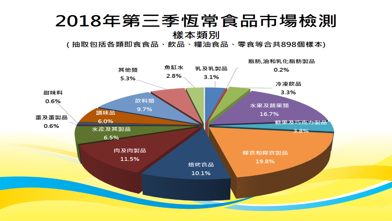 为保障消费者的食用安全,食安中心依据目前流通市场的食品种类和特点,制定 “常规食品调查”及“食肆食品调查”计划。抽样调查的范围包括本澳各区之超级市场、杂货店、百货公司、饮食场所、网店及外卖店等,抽取各类即食食品、饮品、粮油食品、零食等。食安中心在本年第三季合共抽取八百九十八个样本进行化学、微生物学及辐射水平等检验,整体合格率99.8%。