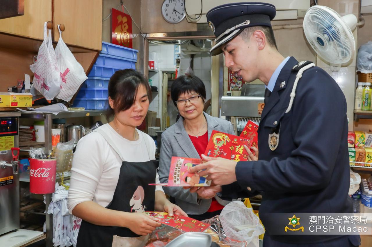 治安警察局人员联同街坊总会北区办事处代表向商户进行冬防宣传
