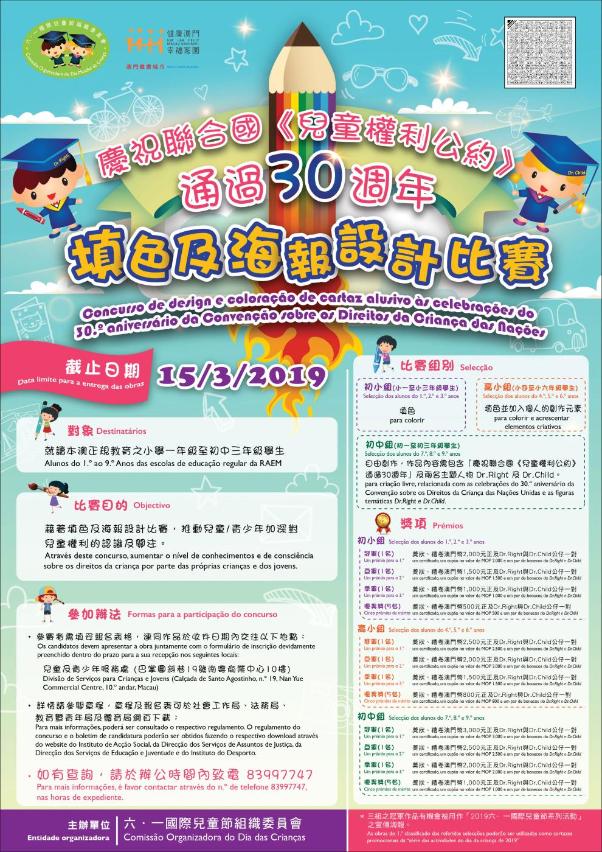 由社会工作局、法务局、市政署、教育暨青年局及体育局组成的六.一国际儿童节组织委员会,现正举办「庆祝联合国《儿童权利公约》通过30周年填色及海报设计比赛」,欢迎本澳学生踊跃参与。