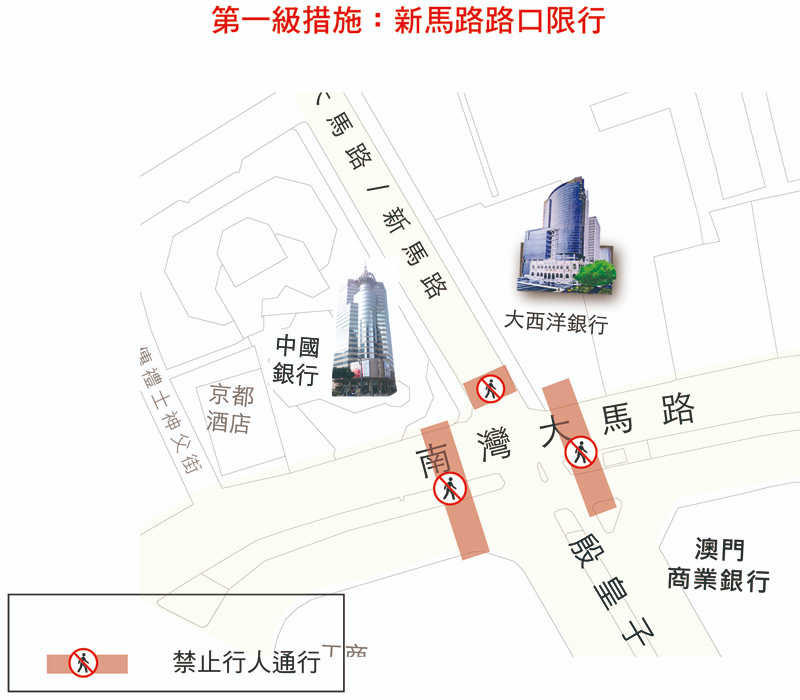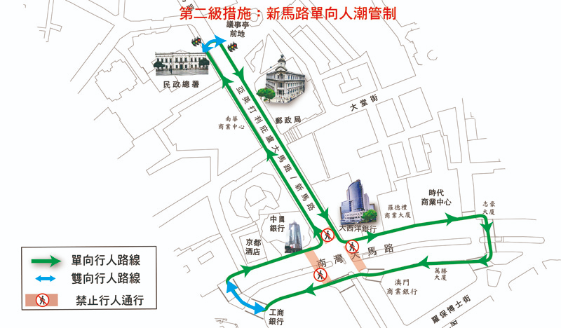 当第一级措施未能解决人群持续挤拥问题时,在第一级的基础上,新马路将实施单向人潮管制。行人需遵照附图所示‘倒T’字型单向行进路线前往议事亭前地、大西洋银行、汇丰银行、商业银行、工商银行、中国银行及市政署等地点。