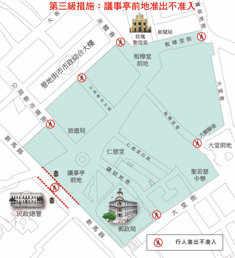 当新马路及议事亭前地人群出现大范围挤拥时,在第二级的基础上,议事亭前地至玫瑰堂整片区域将会视乎实际情况采取局部或全部封闭,届时在区域内的人群可以离开,区域外的人士不可内进。