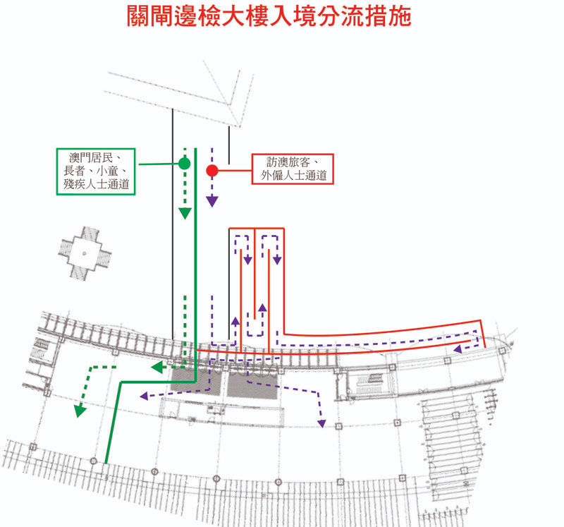 当离境大堂接近饱和时,关闸广场风雨廊路段,会实施“分流及分段放行”的措施,临时封闭该走廊两边,在特定位置设立出入口。澳门居民、六十五岁或以上长者、孕妇、伤残人士和三岁及以下小童,将因应实际情况,安排使用其中一条专用队列,而其余旅客包括外雇人士则使用另一队列。
