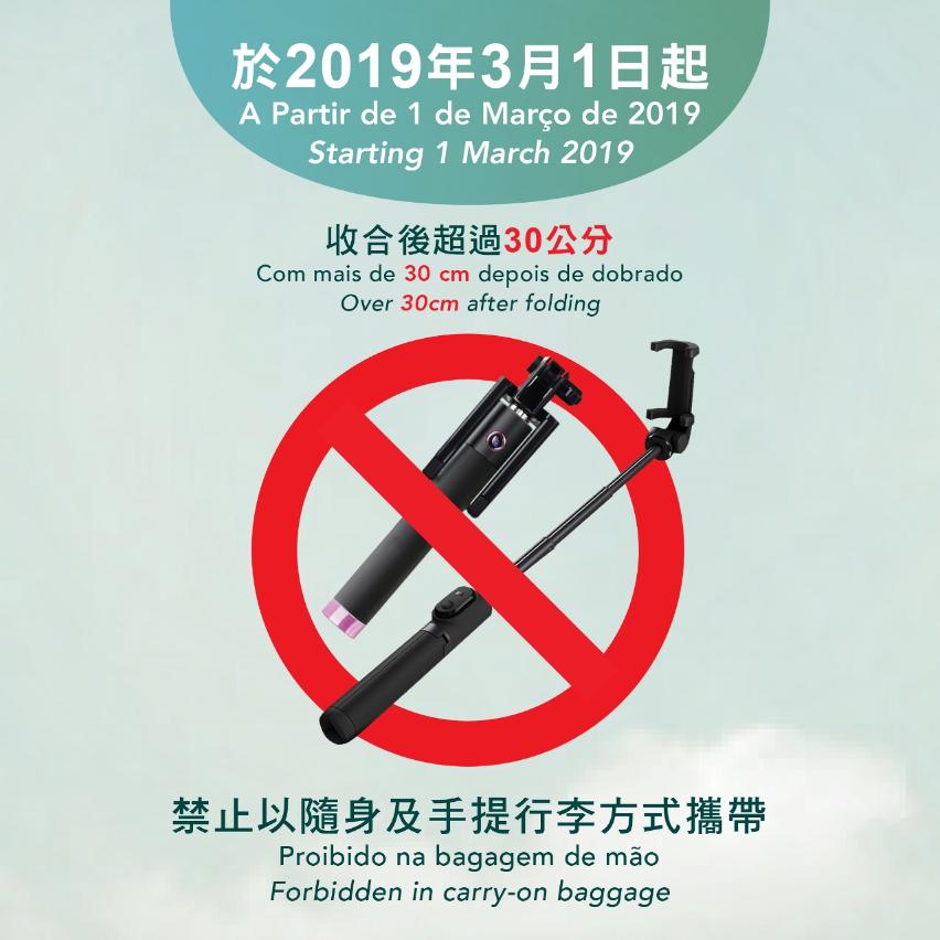 为了在现有的航空保安管制措施上进一步提升安全水平,于2019年3月1日起,澳门国际机场和直升机场实施以下要求:一) 禁止乘客以任何方式携带打火机 (包括火柴);二) 禁止乘客在随身行李和手提行李携带收合后超过三十公分的自拍棍、相机/录像机三脚架和单脚架。收合后长度超过三十公分的以上物品必须以托运行李方式运输。