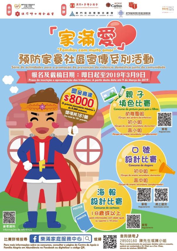 为进一步加强公众对家庭暴力的关注,社会工作局与澳门妇女联合总会合办,并由澳门工会联合总会、澳门街坊会联合总会、澳门明爱、澳门循道卫理联合教会社会服务处、救世军(澳门)共同协办的「家满爱」预防家暴社区宣传系列活动在本年2月推出三项比赛,欢迎有兴趣人士踊跃参与,并于3月9日前递交参赛作品。