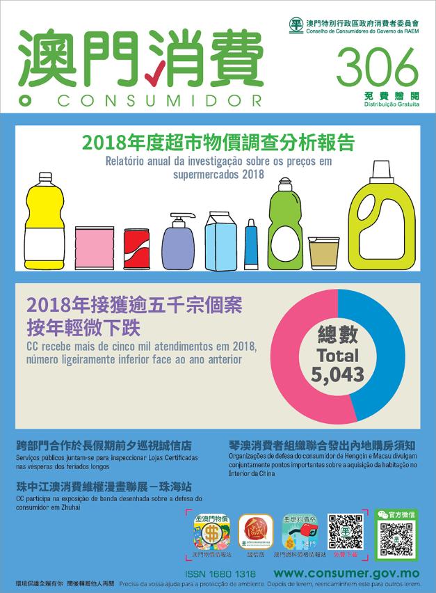 第306期《澳门消费》介绍消委会2018年度的个案数字,全年接到超过5,043宗个案比2017年轻微减少近0.5%,当中投诉及查询个案分别有2,290宗及2,753宗。首五项最多数量的投诉个案依次是珠宝首饰(201宗)、公共交通(166宗)、食品及饮品类(163宗)、个人护理产品及服务(148宗)以及饮食服务(144宗),共占2018年全年投诉个案总数量的三成半,在消委会个案年度分析报告中又反映,2018年与电子支付有关的投诉个案超过20宗,消委会注意到电子支付交易模式的普及化,会透过加强宣传与教育工作,提高消费者自我保护的意识,并建议电商平台加强服务条款等相关资讯的透明度,避免与消费者发生争拗。
