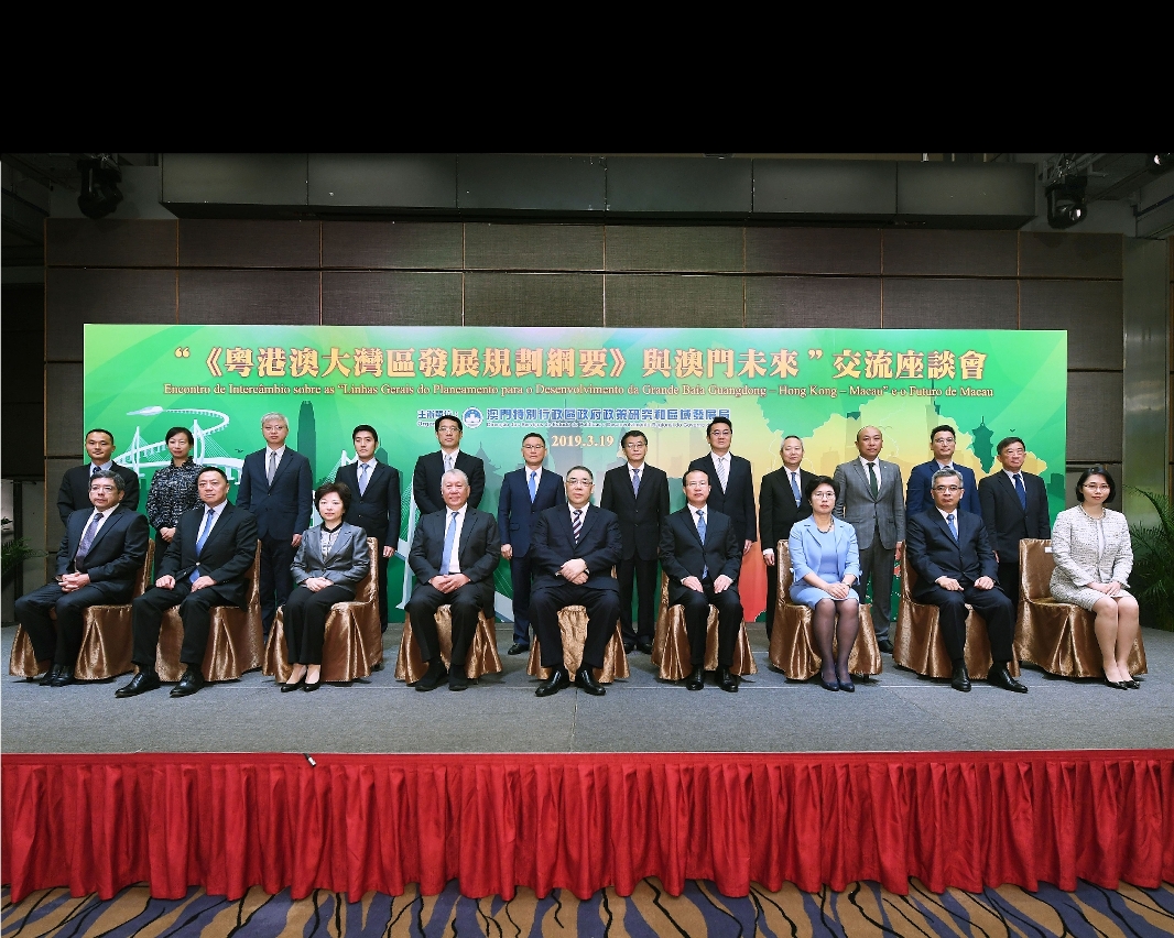 由澳门特别行政区政府政策研究和区域发展局主办的“《粤港澳大湾区发展规划纲要》与澳门未来”交流座谈会于2019年3月19日假澳门旅游塔举行。澳门特别行政区行政长官崔世安、中国人民政治协商会议全国委员会副主席何厚铧、中央人民政府驻澳门特别行政区联络办公室主任傅自应、外交部驻澳门特别行政区特派员公署特派员沈蓓莉等出席座谈会。行政长官、外交公署特派员以及与会官员均全程参与了座谈会,认真听取了各专家学者、业界与社团代表的建议。