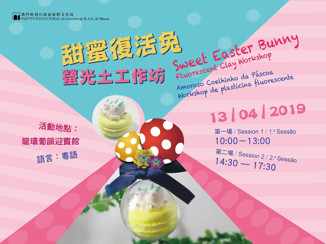 为让市民感受复活节的节日气氛,文化局将于4月13日(星期六)在龙环葡韵迎宾馆举办两场“甜蜜复活兔──萤光土工作坊”,费用全免,欢迎年满6岁或以上的巿民报名参与。