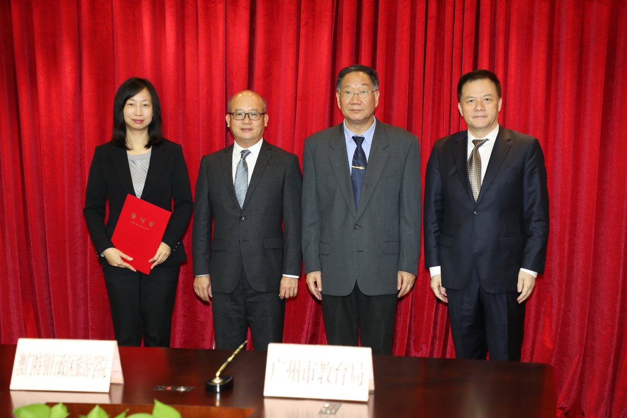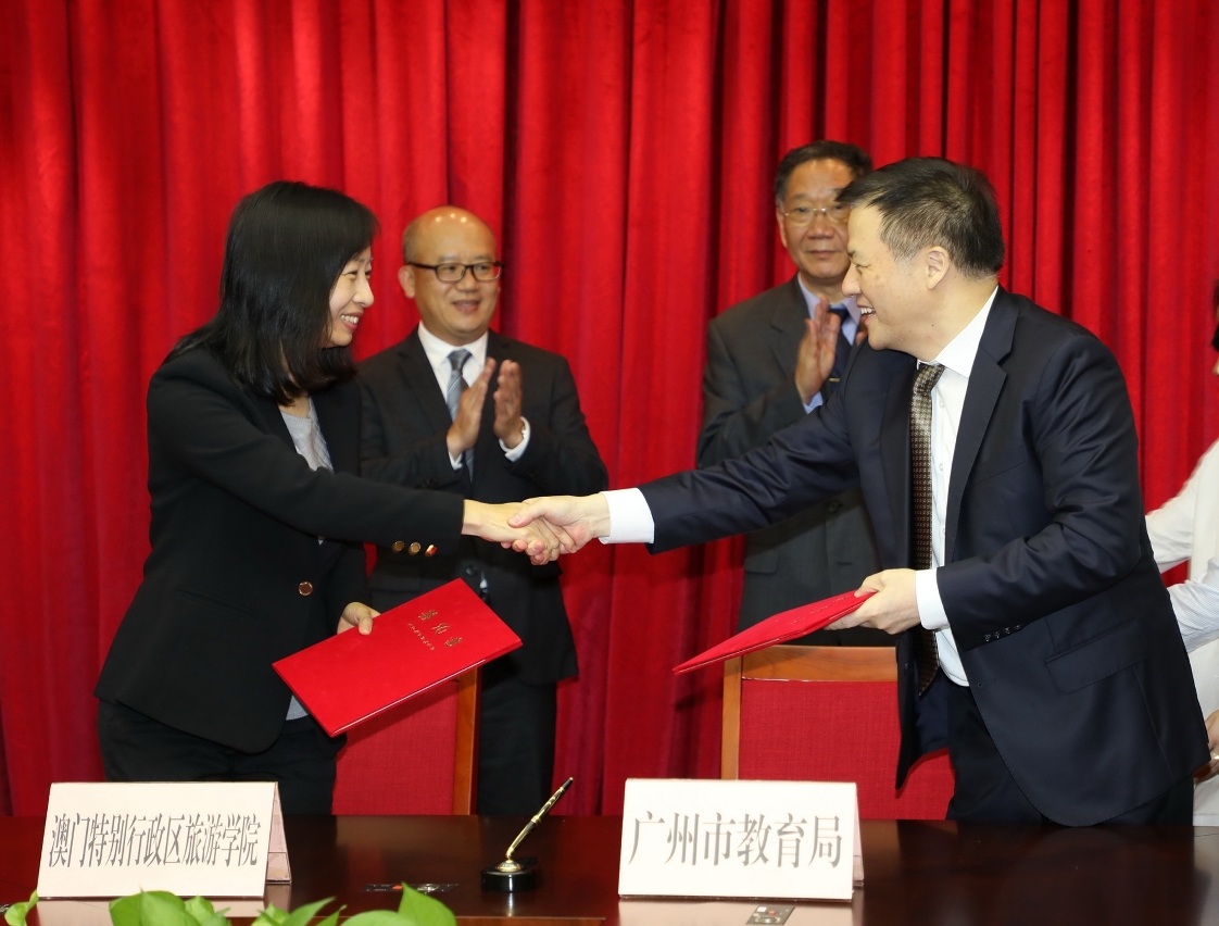 旅游学院与广州市教育局签署合作协议,双方将共同构建广州旅游职业教育与澳门旅游教育的合作关系。合作协议签署仪式于3月20日在广州市政府举行,旅游学院院长黄竹君及广州市教育局局长樊群代表所属机构签署, 由高等教育局曾冠雄代局长及广州市政府副秘书长张建华见证。今次签署此合作协议,将为旅游学院与广州市教育局在旅游教育和培训合作方面奠定更坚实的基础。