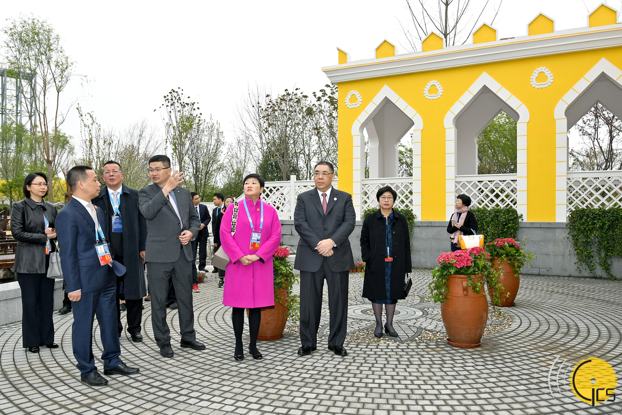 开幕式前,行政长官一行参观了北京世园会内的澳门园,国务院港澳事务办公室副主任黄柳权同行参观,由市政署市政管理委员会副主席罗志坚介绍澳门园概况。