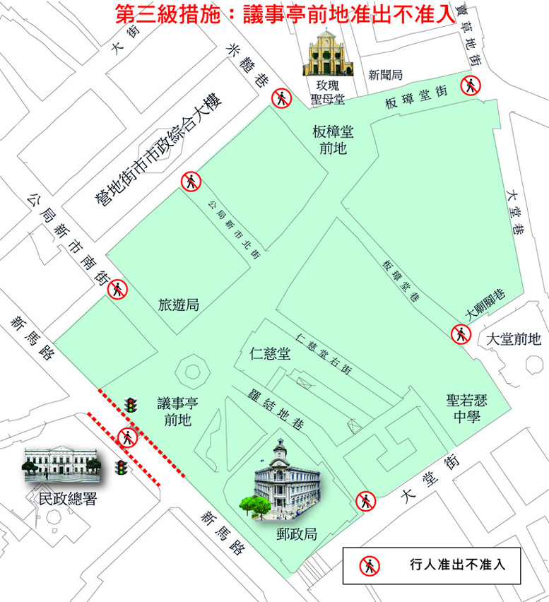 当新马路及议事亭前地人群出现大范围挤拥时,在第二级的基础上,议事亭前地至玫瑰堂整片区域将会视乎实际情况采取局部或全部封闭,届时在区域内的人群可以离开,区域外的人士不可内进。