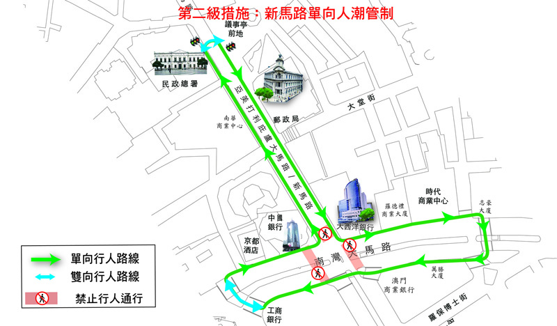 当第一级措施未能解决人群持续挤拥问题时,在第一级的基础上,新马路将实施单向人潮管制。行人需遵照附图所示‘倒T’字型单向行进路线前往议事亭前地、大西洋银行、汇丰银行、商业银行、工商银行、中国银行及市政署等地点。