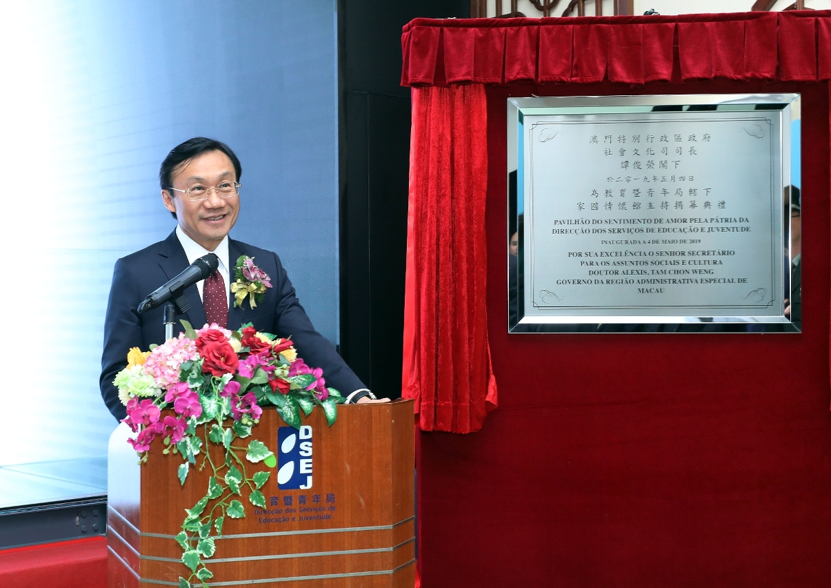 家国情怀馆揭幕仪式于5月4日下午顺利举行。谭俊荣于致辞时表示,在纪念五四运动100周年及澳门回归祖国20周年之际,教育暨青年局特设立家国情怀馆,将其作为一个爱国爱澳教育的基地,意义非凡。特区政府一直高度重视青年学生的爱国教育,持续开展各个层面的工作,透过多样化的形式,提高其对国家的历史、文化、政治、经济、社会、民生等方方面面的认识,增进其家国情怀,鼓励其传承及弘扬中华优秀传统文化。家国情怀馆将为青年学生提供一个深入瞭解中华文化、国家及澳门发展历程的综合多功能活动空间,并以“家国情怀”为主题,开展多元化的现场教学活动及“青年学生家国情怀户外教育计划”户外参观学习。期望日后家国情怀馆能发挥其综合功能,并与社会各界合作,尤其是教育界与青年社团,深化青年学生的爱国爱澳教育。