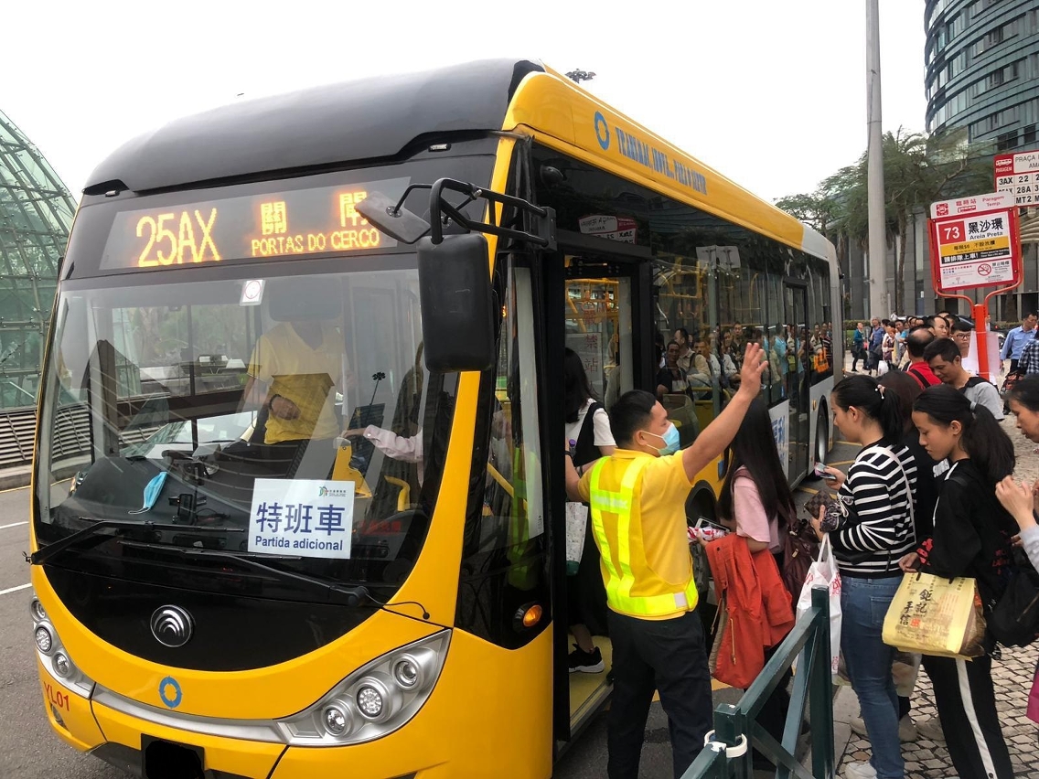 关注到「五‧一黄金周」期间大批旅客访澳,交通事务局在假期前已联同相关部门及公司举行会议,商讨应对安排,包括要求各营运公司留意客流情况适时增加营运车辆数量及发车班次,做好各项优化候车环境工作、增加人手引导乘客上车及理顺排队秩序等,并设立通报机制,应对各种突发事件。在公共巴士服务方面,除开通3BX及51X单向路线巴士,亦调整部份巴士站安排;加密18条路线巴士之班次及安排21A部分班次以大巴行驶;巴士公司在关闸口岸附近设置咨询站向乘客提供巴士服务资讯,同时安排拖车于重要路段处理车辆故障的情况;在繁忙时段,巴士公司也实施了预先制订的亚马喇前地紧急应变方案,以疏导交通挤塞情况,亦抽调车辆(包括18米大巴)以点对点方式疏导亚马喇前地的乘客前往关闸。