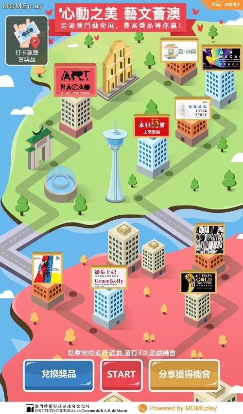 “MOMEplay有奬游戏”由即日起至7月4日期间在官方微信号“澳门文化局”举行,参与者只需关注官方微信号“澳门文化局”,再进入有奬游戏页面,便可游览“艺文荟澳”主体核心活动“Art Macao国际艺术大展”澳门艺术博物馆主场展以及多个旅游度假村和酒店艺术展,途中获得道具参与抽奬。此外,为鼓励更多公众亲身欣赏各具特色的展览,游戏更设有线下打卡有奖游戏,参加者亲临七个指定地点进行打卡,将有机会抽中丰富奖品。线上及线下游戏奬品十分丰富,包括由六大旅游度假村提供之酒店住宿、水疗服务、餐饮现金券等,亦有Dyson 三合一风扇暖风空气清新机、华为P30 Pro手机、超市现金券和大会纪念品等,机会难逢,万勿错过。