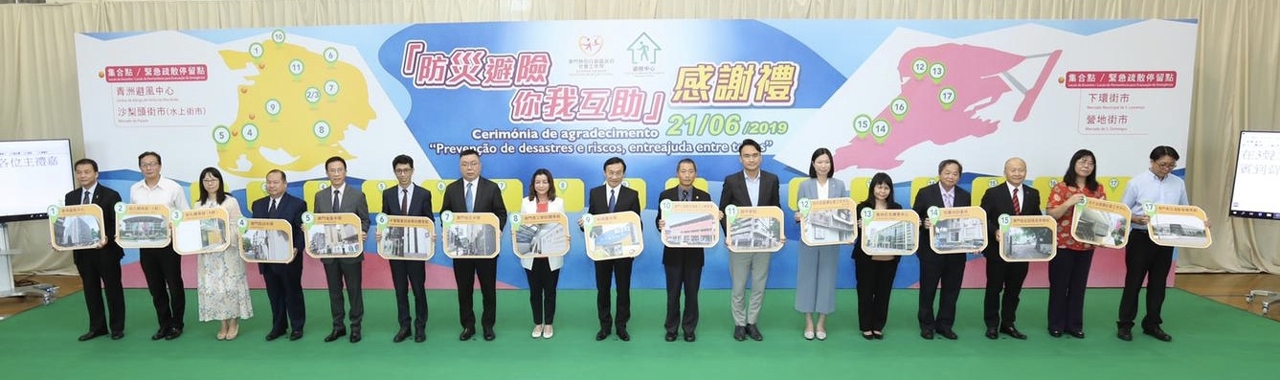 社会文化司谭俊荣司长、社会工作局黄艳梅局长和韩卫副局长、澳门保安部队高等学校许少勇校长、警察总局梅山明局长助理、教育暨青年局龚志明副局长、澳门理工学院李雁莲副院长、卫生局叶炳基代副局长、市政署综合服务及质量监察厅何菁华厅长、体育局体育设施管理厅何华厅长、澳门海星中学校黄彪校长、利玛窦中学张慧玲校长、澳门培正中学郭敬文副校长、澳门慈幼中学区志权副校长、镜平学校小学部刘少娟副校长、澳门少年飞鹰会原锦成总监和澳门工会联合总会梁伟峰理事长,为「防灾避险、你我互助」感谢礼主持启动仪式。