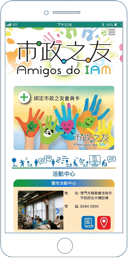 市政署为方便并鼓励市民使用本署辖下各活动中心的设施,将可于资讯服务亭自助办理“市政之友”会员卡及开通活动中心会籍,配合“市政之友”流动应用程式,即可轻松绑定“市政之友”电子会员卡,方便市民轮候活动中心的设施。