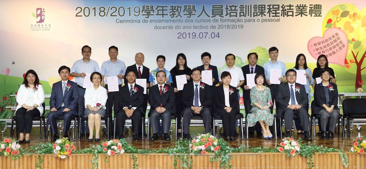 为了与教学人员共同分享完成培训的硕果与喜悦,同时藉此鼓励教学人员持续进修,为教育质素不断的提升作出贡献,教青局于7月4日下午在澳门浸信中学礼堂隆重举行了“2018/2019学年教学人员培训课程结业礼”。教青局局长老柏生、中央人民政府驻澳门特别行政区联络办公室教育与青年工作部副部长苟人民、教青局副局长梁慧琪、澳门大学教育学院院长王闯、澳门中华教育会会长陈虹、澳门天主教学校联会副会长林淑华、澳门公职教育协会监事长许淑贞,以及各培训机构的代表及导师、各校校长及参加培训课程约500名教学人员出席了典礼。