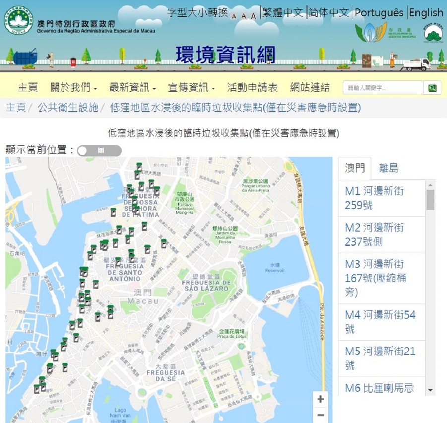 本澳现正进入台风季节,为应对台风及风暴潮可能出现的环境卫生状况,市政署制定一系列措施并持续宣导推广,当中有关五十五个「低洼地区水浸后设置之临时垃圾收集点」的资讯已上载至环境卫生网,市民亦可透过扫瞄二维码连结网页,便捷的查阅最新临时垃圾收集点的位置及资讯。
