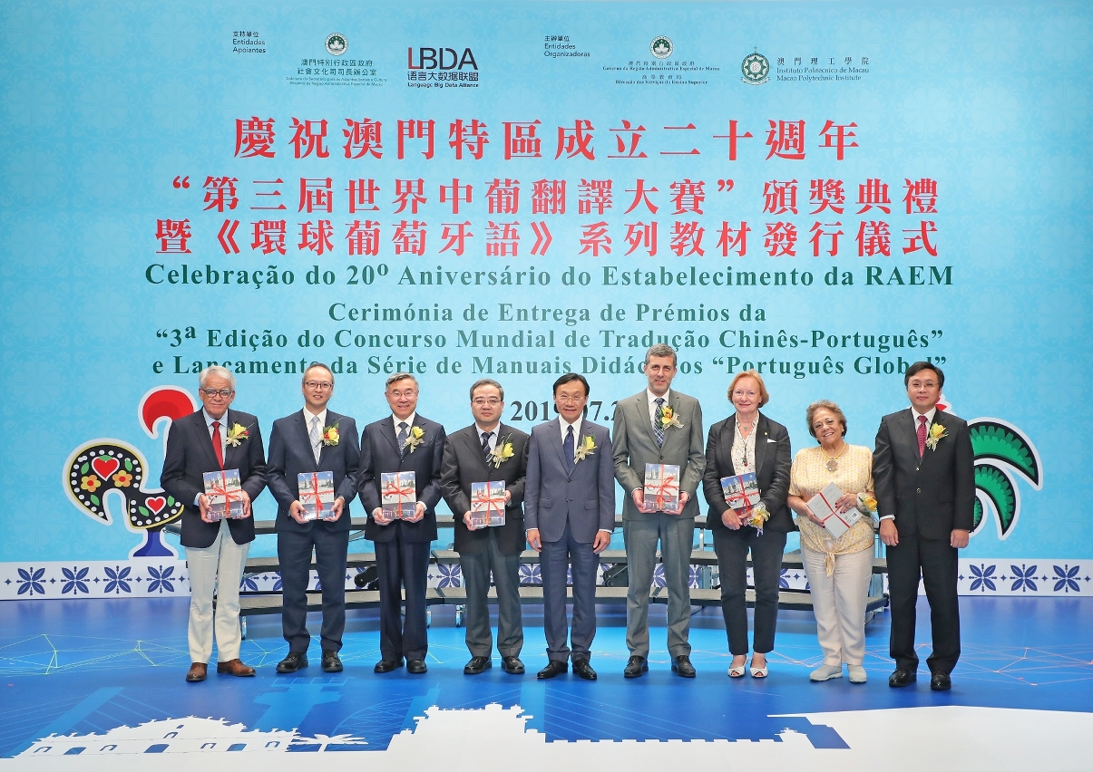 为庆祝澳门特区成立二十周年、加强世界各地中葡语言翻译技术的交流,培养中葡翻译专才,进一步推动中葡翻译教学与科研的最新成果在澳门、中国内地及“一带一路”沿线葡语国家的应用,7月24日下午,由澳门特别行政区政府社会文化司司长办公室及语言大数据联盟支持,高等教育局与澳门理工学院合办的“第三届世界中葡翻译大赛”颁奖典礼暨《环球葡萄牙语》系列教材发行仪式在澳门理工学院举行。作为全球唯一的国际性中葡翻译比赛,本届大赛吸引来自世界多地四十三所高等院校共一百六十六支队伍参加,澳门理工学院荣获比赛冠军及“澳门高等院校队特别奖”冠军,葡萄牙米尼奥大学获亚军及巴西FAAP商务孔子学院获季军。由澳门理工学院、葡萄牙里斯本大学与商务印书馆合作出版的《环球葡萄牙语》第四册教材,在活动上举行了发行仪式,借助世界中葡翻译大赛的平台,将中葡合作的重要成果向世界推广,意义深远。