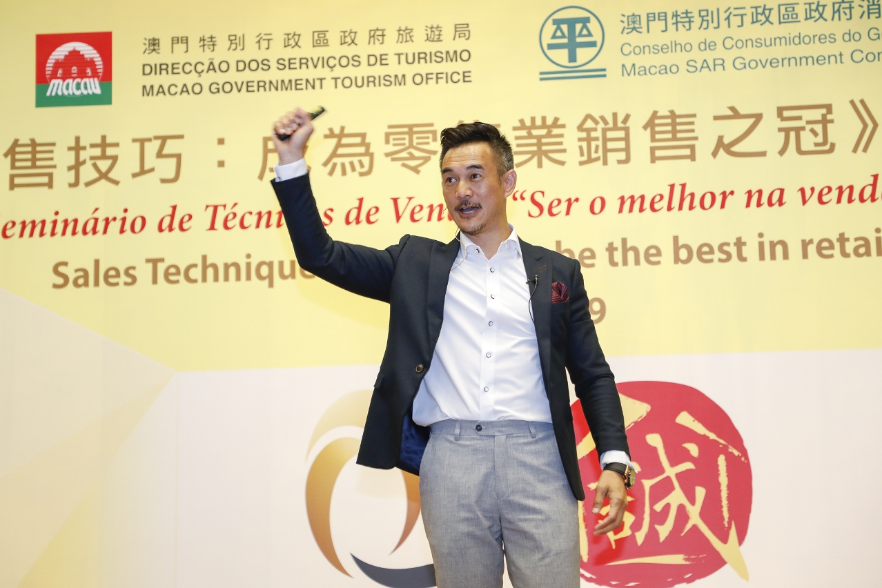 旅游局代局长程卫东、消费者委员会执行委员会主席黄翰宁和旅游局培训及质量管理厅厅长梁美彩等出席讲座。来自香港的销售培训导师车志健(Brian Cha)应邀担任主讲嘉宾,向约三百六十位来自澳门“诚信店”商户的零售业从业员分享销售秘诀。