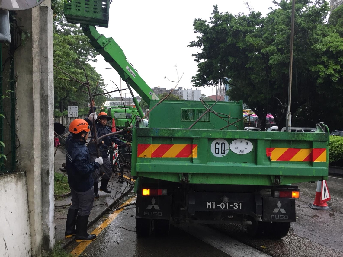 市政署接获四宗树木受损报告,当中三棵树木被强风吹倒,市政署人员已作出扶正处理,亦移除一棵危树并清理树木断枝。而路环樟树街道路出现损毁,市政署人员亦已作临时处理。