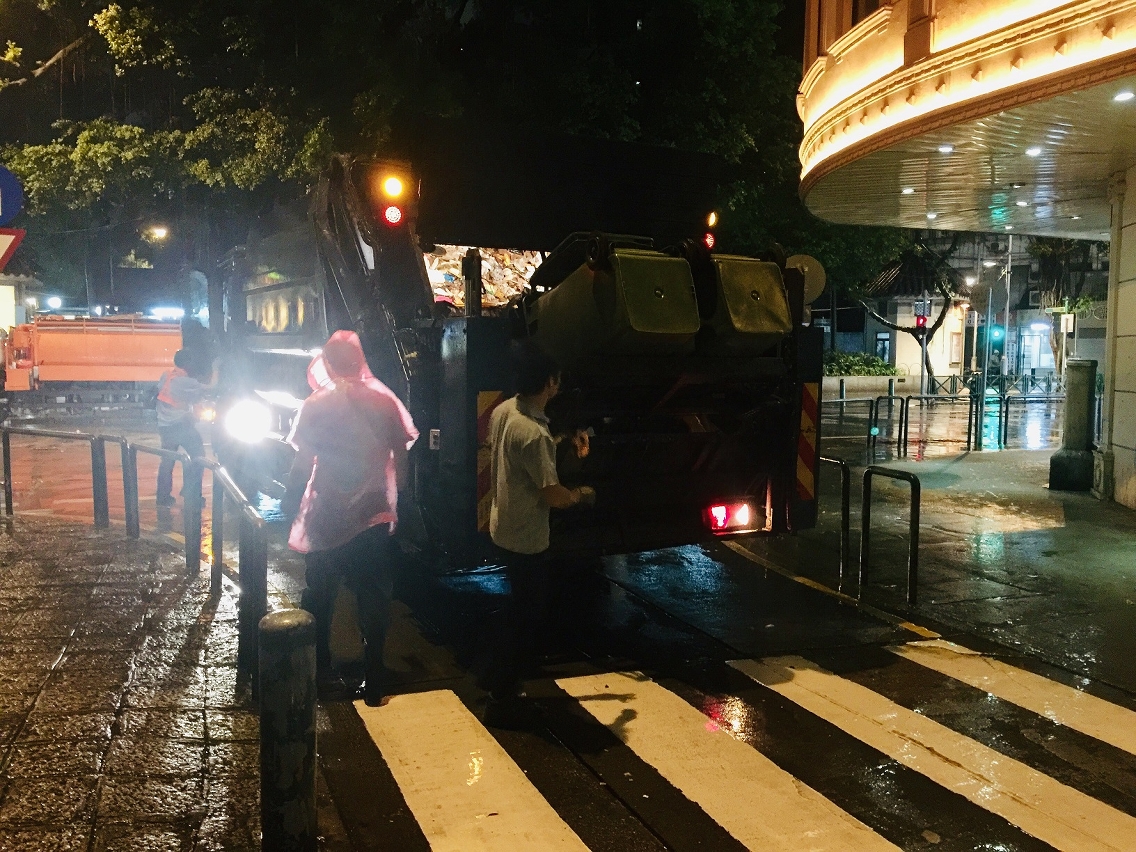 在垃圾清运方面,市政署协调清洁专营公司在悬挂八号风球前加紧街道垃圾收集工作;在八号风球除下后,清洁专营公司随即额外加派人员及车辆通宵到各区收集垃圾及跟进清理街道工作,共派出二十三台垃圾车及十台压缩桶吊运车进行垃圾清运工作,所收集的垃圾量约六百三十五吨,与平日相若。