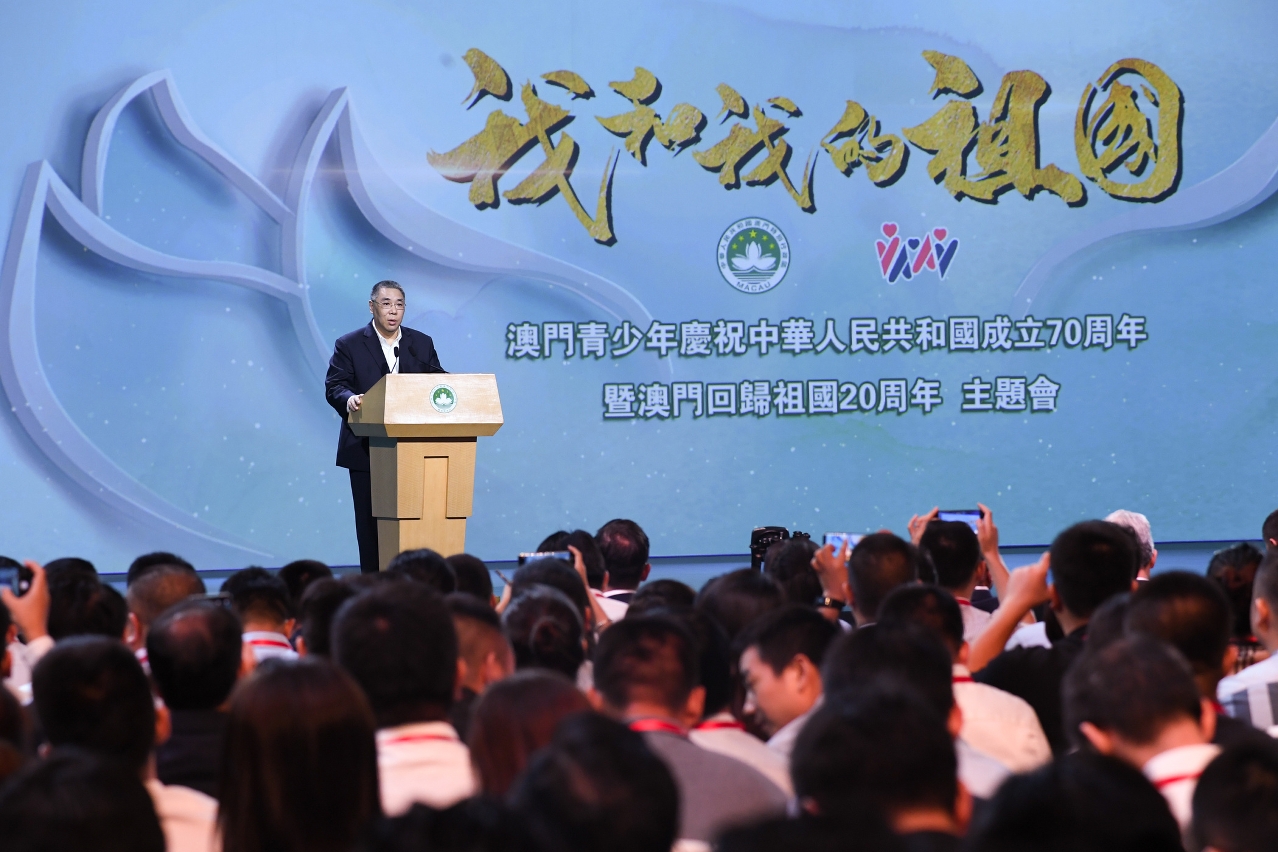 澳门青少年庆祝新中国成立70周年和澳门回归祖国20周年系列活动“我和我的祖国”主题会今(3)日举行。行政长官崔世安在主题会上致辞时表示,透过举办围绕爱国爱澳为题的“新时代同心行”参访团和“我和我的祖国”主题会,将使青少年更坚定爱国之心、报国之志,更坚定地与祖国同心、与祖国同行。