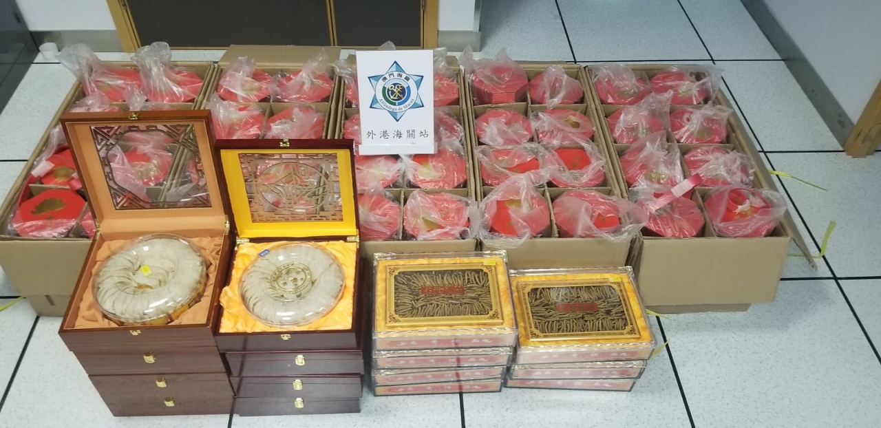 本月11日下午,海关关员截查一名由香港乘坐客船抵澳的旅客,经X光机及关员检查,于涉事旅客的物品内共查获6公斤干燕窝、4.3公斤冬虫夏草及月饼200个,该批物品价值合共澳门币77,000元。