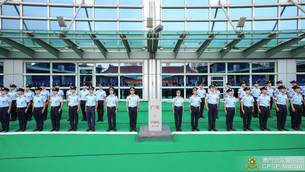 治安警察局梁文昌局长与珠海边检总站涂林总站长分别带领双方领导、主管及前线人员,在关闸出入境事务站与拱北口岸之间的粤澳边界线旗杆处参与庄严的升国旗仪式,随后双方人员合唱一曲《歌唱祖国》,活动吸引了不少旅客驻足观看。