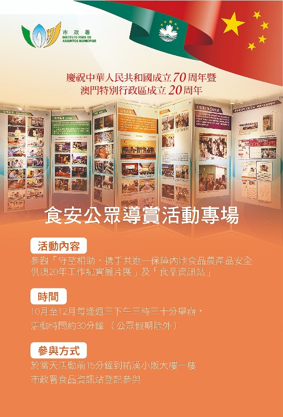 为庆祝中华人民共和国成立七十周年及澳门特别行政区成立二十周年,市政署将于十月至十二月期间,特设食安公众导赏专场活动,由食安教育人员带领参观“内地食品农产品供澳二十年图片展”及“食品资讯站”,加深社会大众对内地供澳食品的安全监管及稳定供应方面的瞭解,以及本澳保障食品安全的措施,欢迎市民踊跃参与。