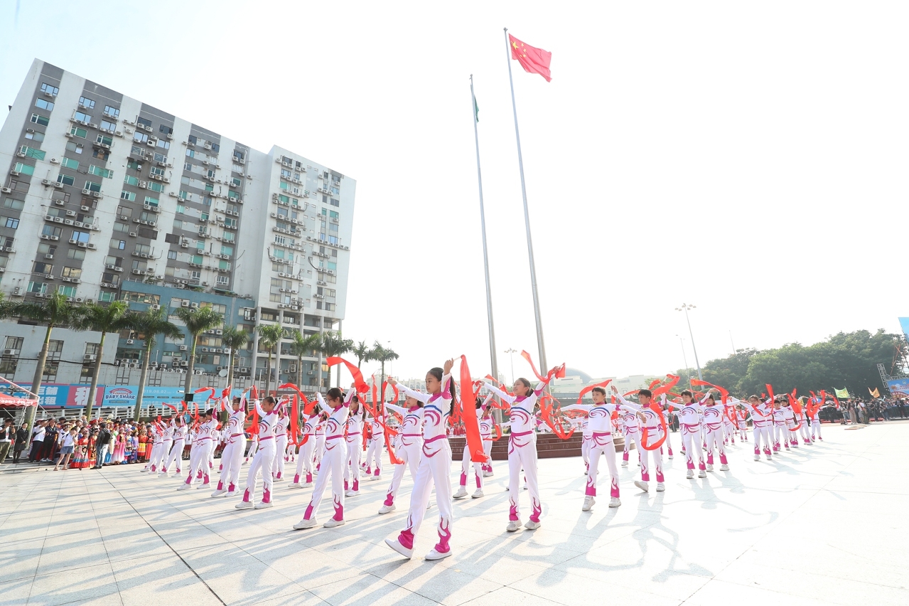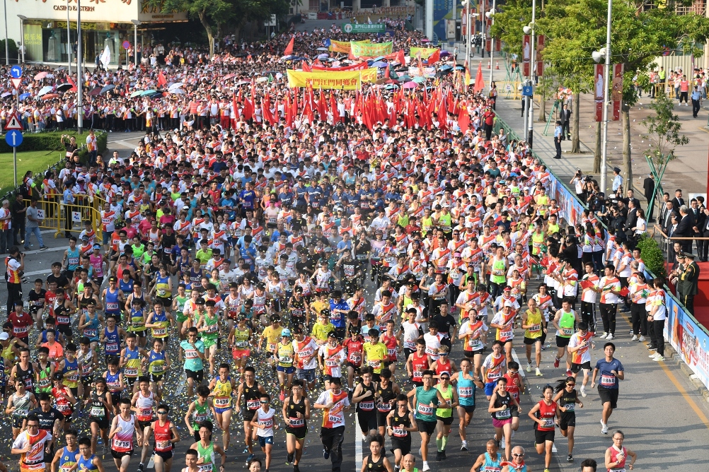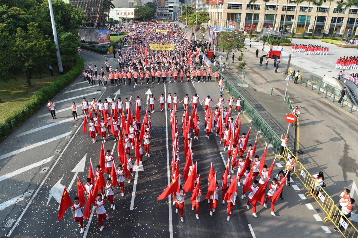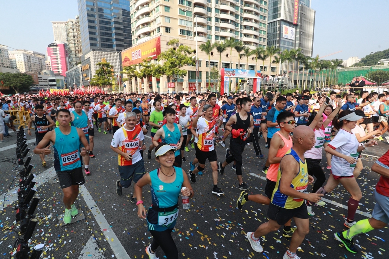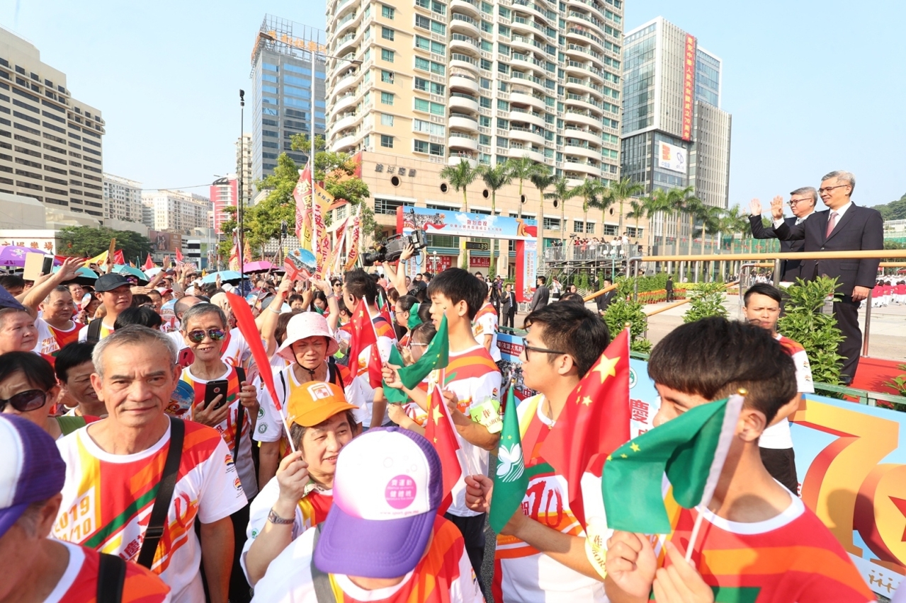 由澳门特别行政区政府主办、体育局承办、中国澳门田径总会协办之“2019澳人齐贺国庆世界步行日欢乐跑”活动,今日(1日)上午八时十五分于金莲花广场前举行,由澳门特别行政区代理行政长官黄少泽先生主持起步礼,吸引一万八千名参加者在礼炮声中愉快地起步。