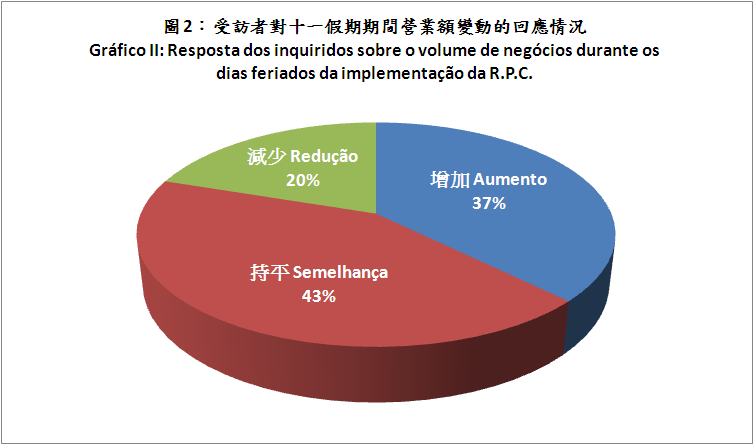 营业额方面,37%受访商户(585间)表示其营业额相对平日有所增加,平均增幅为24%,营业额增幅较大的行业包括有化妆品及卫生用品、西药房、电子产品、皮具以及服装及鞋类;表示营业额持平的商户约43%;而减少的只有20%。如按营业额增长较高之店铺所在区域划分,升幅较大的店铺所在区份有路氹度假购物中心、氹仔官也街、白马行及议事亭前地及大三巴。整体而言,所有受访商户的平均营业额有约3%的增幅。