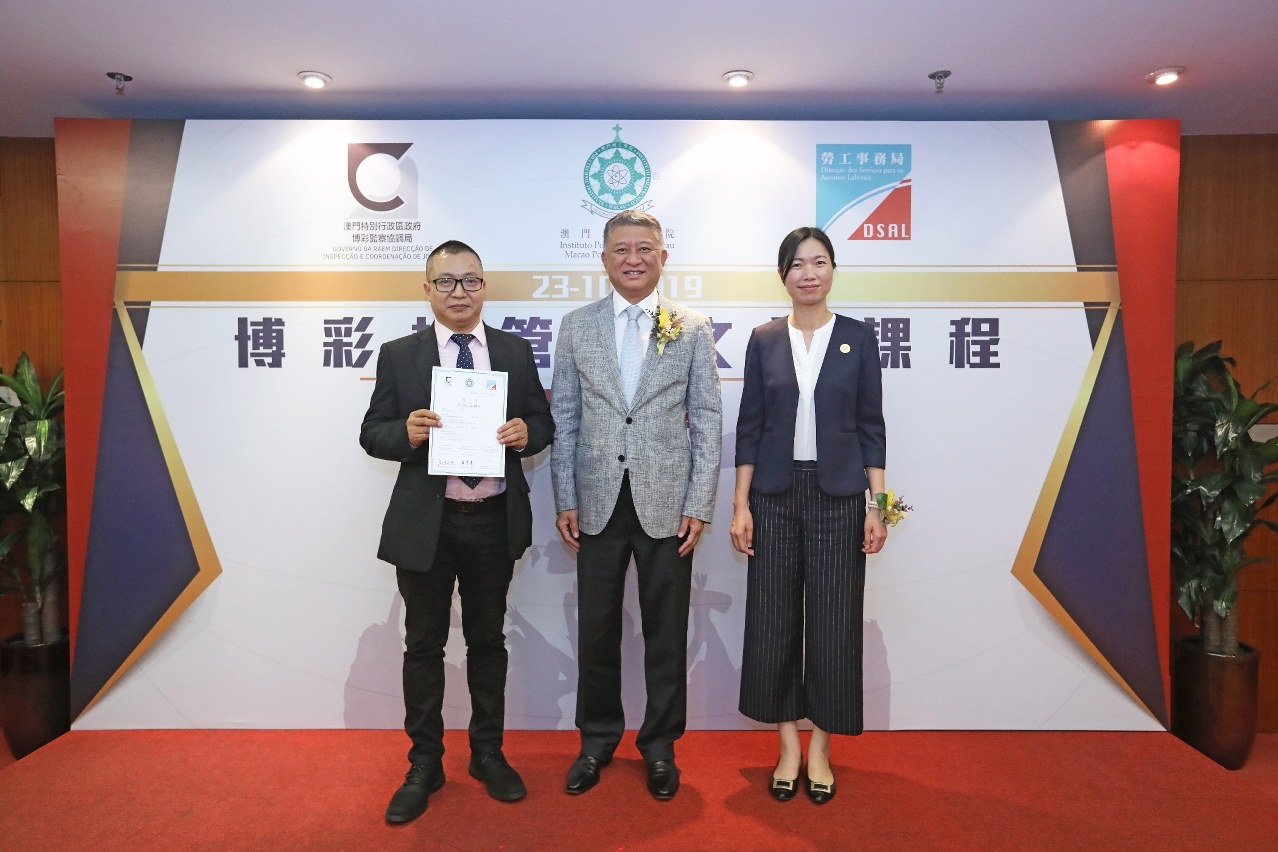 “博彩机管理文凭课程”是博监局、劳工局和理工学院合作开办的课程,目的是培养博彩机技术方面的本地管理人才,支持本地雇员向上流动。课程包含“博彩科技”、“角子机管理”、“博彩法”、“管理学导论”、“商务沟通与公共管理”以及“项目管理”等科目。本期“博彩机管理文凭课程”从2018年5月开课,到2019年7月结束。理工学院博彩旅游教学及研究中心主任王长斌在致辞中赞扬学员兼顾工作、学业及家庭三方面,努力进取,克服困难,在一年多的时间里风雨兼程,圆满完成学业。毕业学员表示学科知识有助拓阔他们在业务营运工作中的视野,提升工作绩效和管理团队的能力。