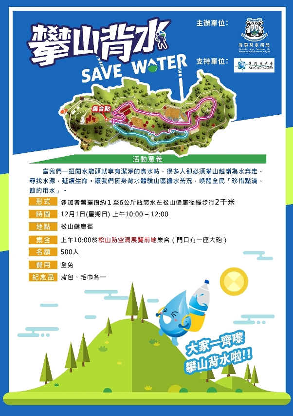 为使公众体验内地山区人民攀山越岭担水的艰辛,海事及水务局将于12月1日早上10:00举办“2019攀山背水”活动,参加者可按自身能力,选择背起约1至6公斤的食水缓步行约2千米,从而鼓励社会各界珍惜点滴、节约用水。活动报名日期由即日起至11月25日,欢迎公众报名参与。