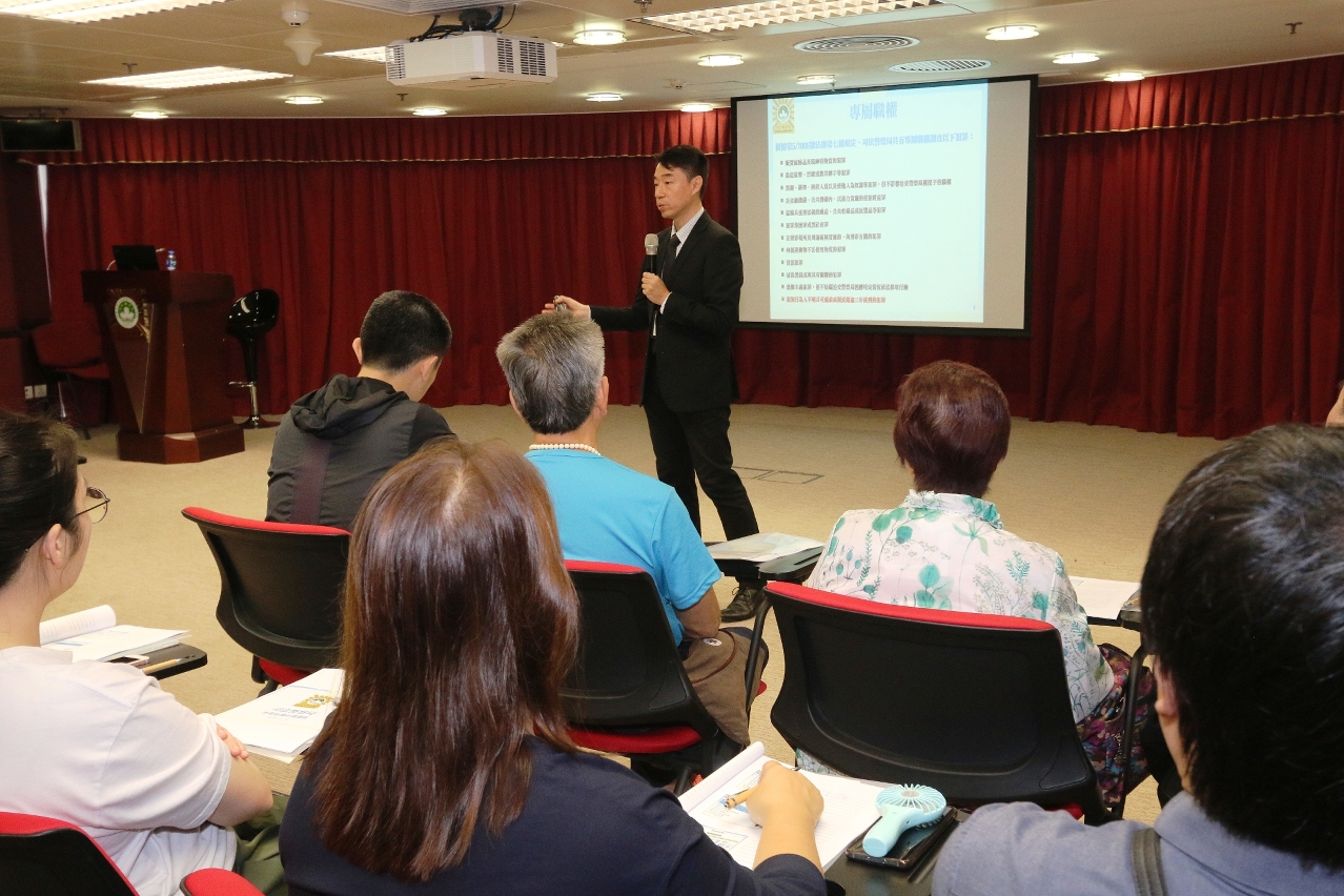 培训课程上,司警局人员透过入屋盗窃、电话诈骗、伪钞及毒品犯罪等真实案例,详细讲解不法份子的作案手法和防罪方法,并进行小组讨论,加深社团会员对防罪知识的瞭解,提高他们对常见罪案的辨识力和防范能力,同时藉着他们于社区的网络将防罪资讯广为传播,促进警民合作,共同防范罪案发生。课程完结后由司警局副局长杜淑森向完成课程的社团会员颁发证书。
