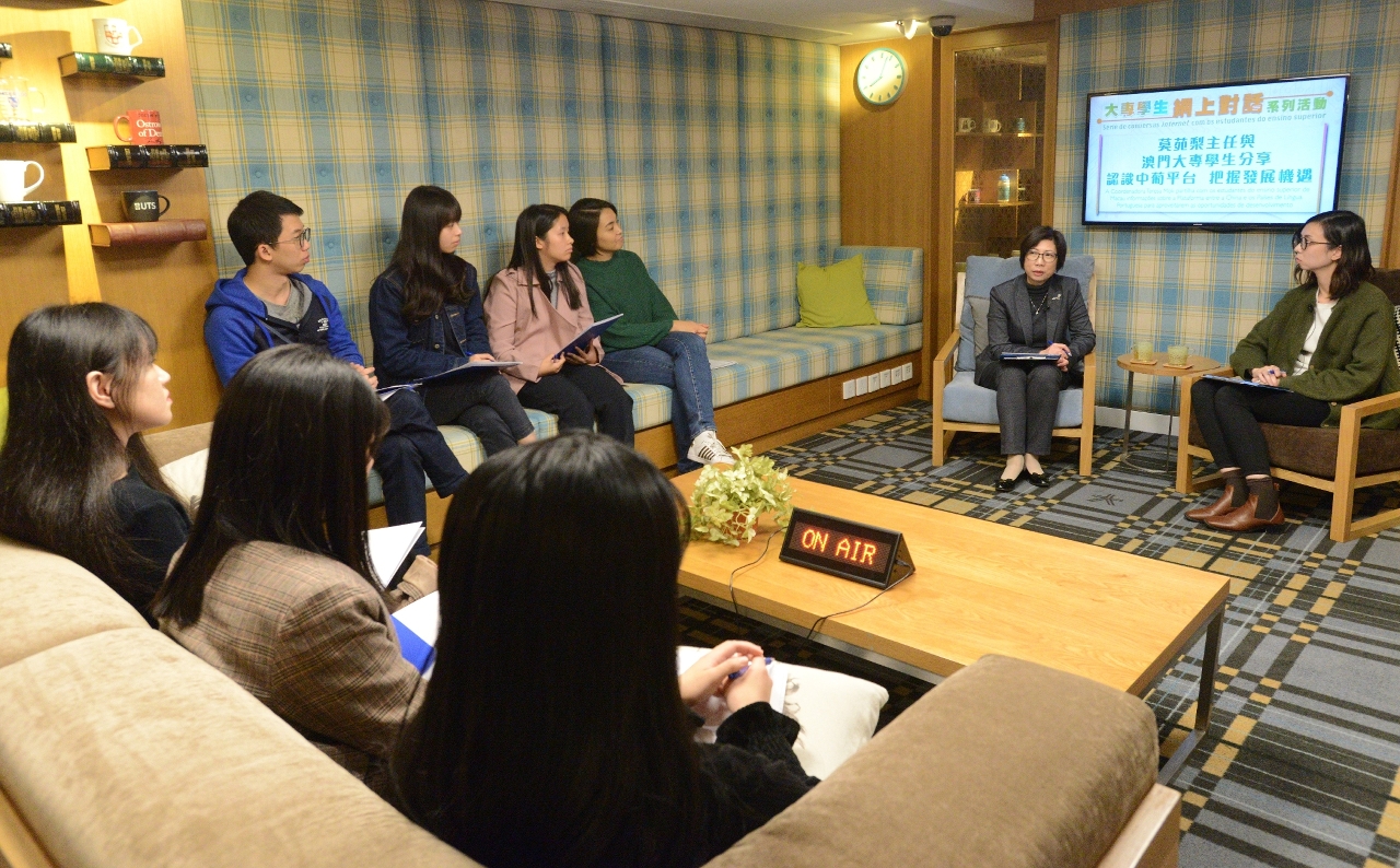 是次网上对话主题为“莫苑梨主任与澳门大专学生分享认识中葡平台 把握发展机遇”,吸引了于本澳、内地、台湾地区及葡萄牙等地升学的学生透过澳门大专学生部落聊天室、Facebook直播平台,以及就读于本澳四所高校的大专学生现场与莫主任互动交流。学生把握机会,踊跃提问,关注的问题包括专业发展、实习机会、区域及国际合作、文化交流等。在历时一个半小时内,莫主任耐心解答学生的提问并与学生分享工作经验,让学生更清晰瞭解中国与葡语国家在经贸、文化等方面的发展情况。