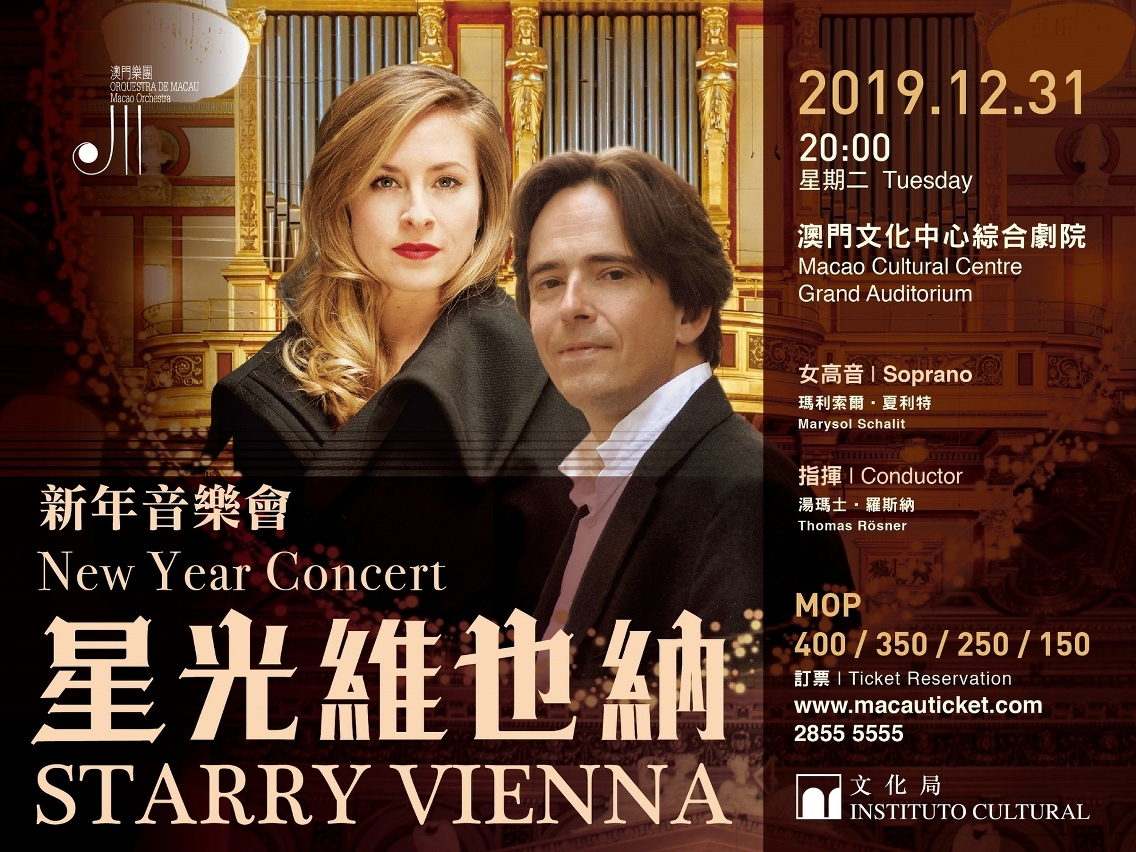 澳门乐团年度巨献《星光维也纳—新年音乐会》12月31日晚上8时在文化中心综合剧院举行,奥地利着名指挥家汤玛士‧罗斯纳、才貌双全的杰出女高音歌唱家玛利索尔‧夏利特,将联袂澳门乐团带来优雅多姿的“维也纳之声”。门票现正于澳门售票网发售,欢迎乐迷购票欣赏。