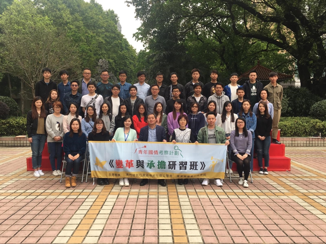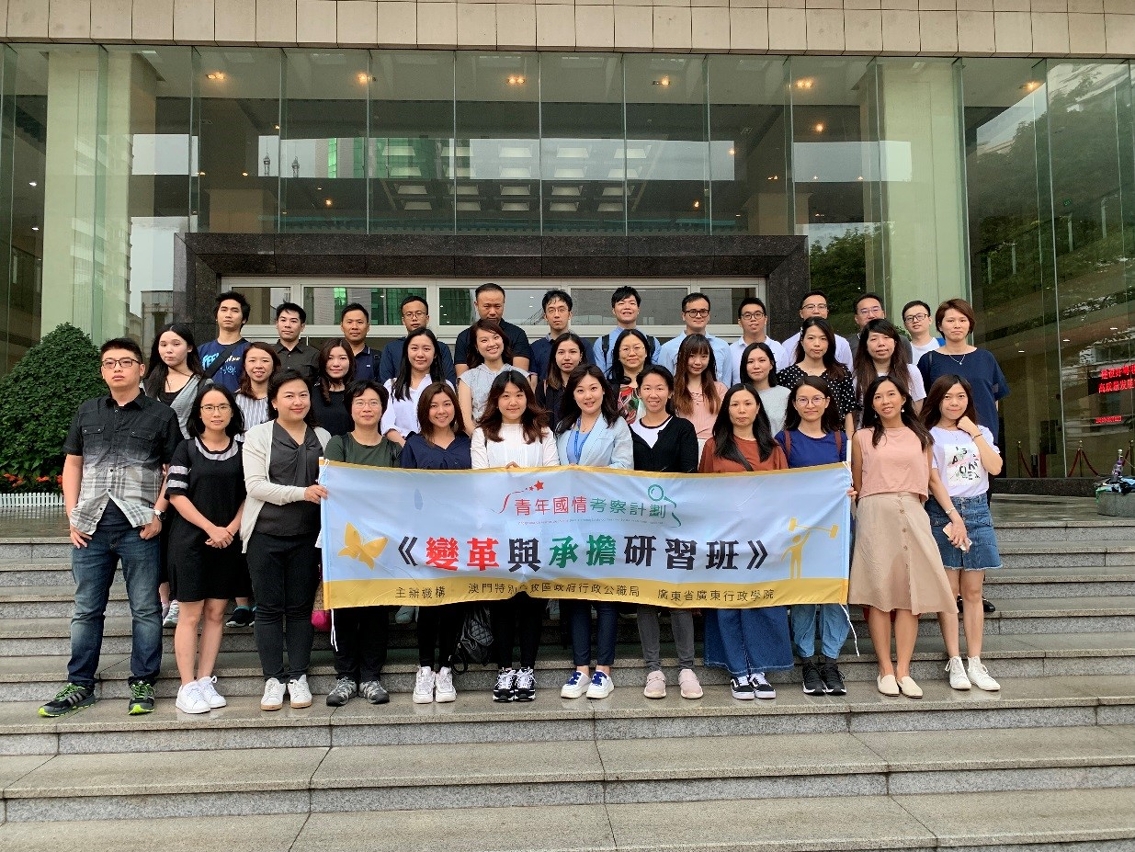 另外,为了让青年的初级公务人员能够瞭解大湾区的发展现状,行政公职局在2019年于广州的中共广东省委党校(广东行政学院)举办了多个《变革与承担研习班》,通过前往内地进行为期3到5天的学习,让学员进一步认识国家政治架构、法规制度、大湾区社经发展情况,加强对粤港澳大湾区建设与澳门特区合作定位、特区的宪政基础等的了解。同时,学员于交流活动中及课余,就我国的国情与内地公务人员和学者等进行交流研讨,从而加深对国情的了解,增进爱国爱澳的情怀。