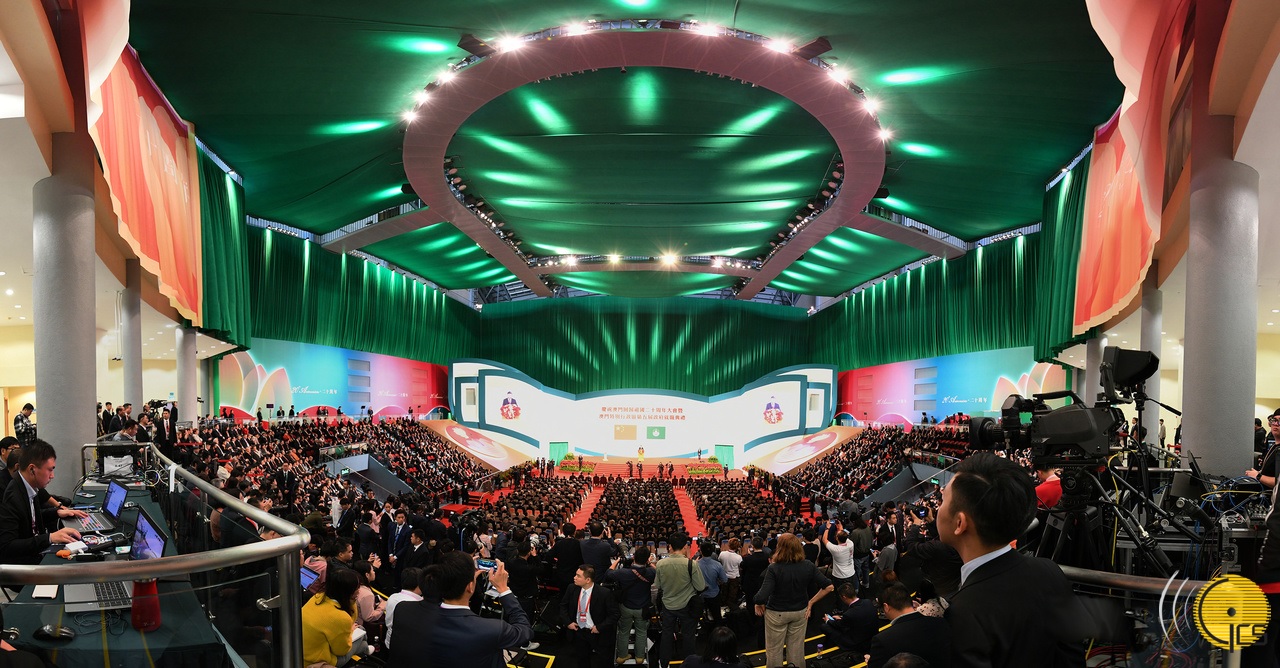 庆祝澳门回归祖国20周年大会暨澳门特别行政区第五届政府就职典礼”今(20)日上午10时在澳门东亚运动会体育馆隆重举行,现场气氛庄严热烈,出席典礼的嘉宾约有1100人。
