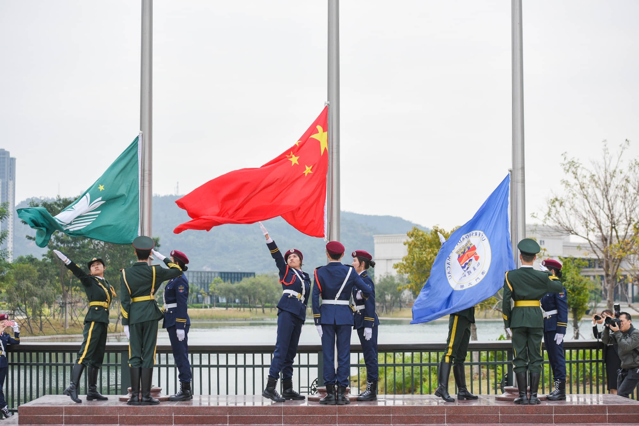 早上8时正,由澳门大学国旗仪仗队、清华大学国旗仪仗队、浙江大学宁波理工学院国旗护卫队组成的升旗方队穿着整齐的制服,迈着铿锵的步伐,走向升旗台。当澳大管乐团奏响起国歌时,三校队员同时把国旗、区旗和澳大校旗抛向蓝天,冉冉升起。